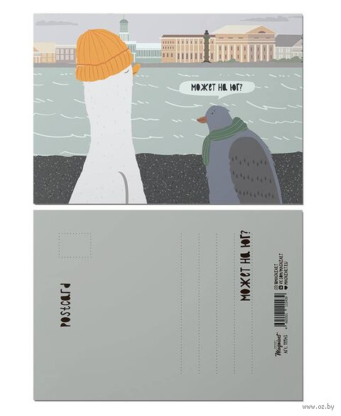 Авторская почтовая открытка. Серия иллюстраций "Питерские Чайки". На открытке изображена чайка и голубь с предложением отправиться на ЮГ.