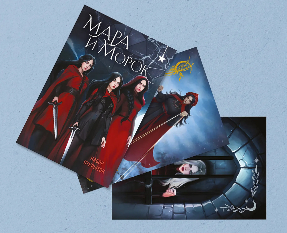 "Мара и Морок", "Мара и Морок. Особенная тень", "Мара и Морок. 500 лет назад" и "Морана и Тень. Плетущая" – в наборе 20 иллюстраций, каждая из которых отсылает к сюжетным событиям одного из романов цикла.