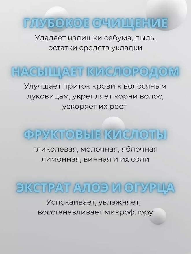 Пилинг для кожи головы на основе комплекса фруктовых кислот (гликолевой, молочной, яблочной, лимонной, винной и их солей) позволяет провести процедуру глубокой очистки: одновременно с отмершими частичками кожи средство удаляет излишки себума, пыли, остатки средств для укладки, что позволяет клеткам быстрее насыщаться кислородом, улучшается приток крови к волосяным луковицам, укрепляются корни волос, ускоряется их рост.