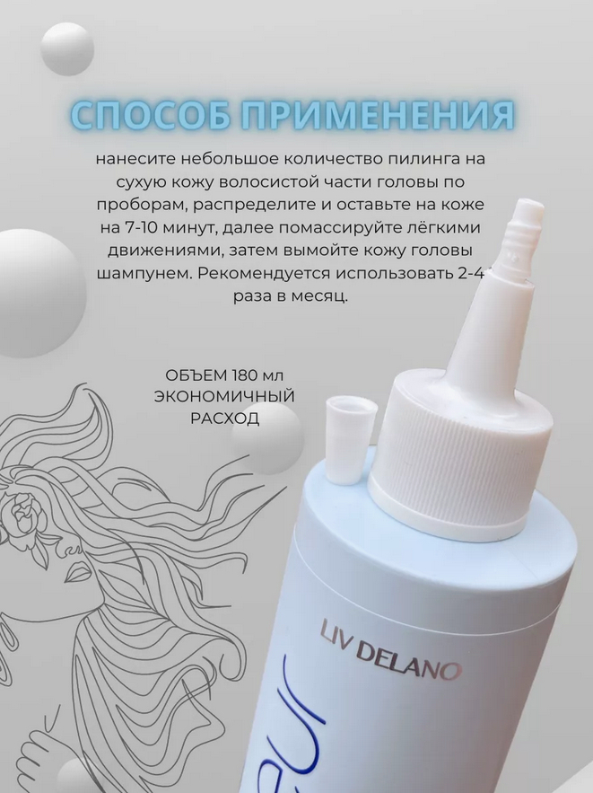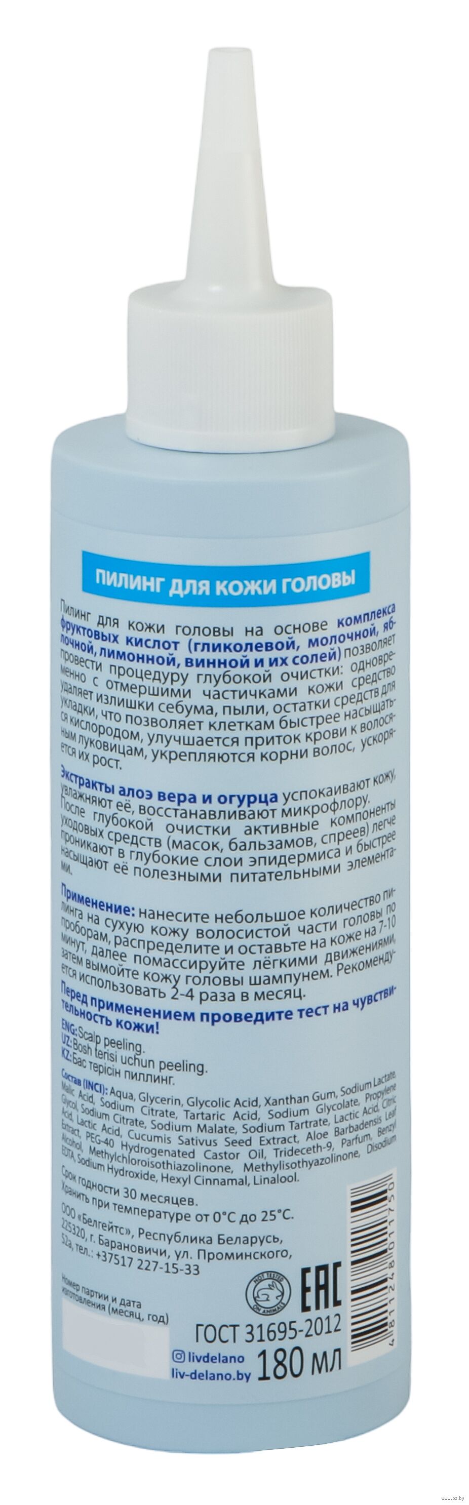нанесите небольшое количество пилинга на сухую кожу волосистой части головы по проборам, распределите и оставьте на коже на 7-10 минут, далее помассируйте лёгкими движениями, затем вымойте кожу головы шампунем. Рекомендуется использовать 2-4 раза в месяц.Состав