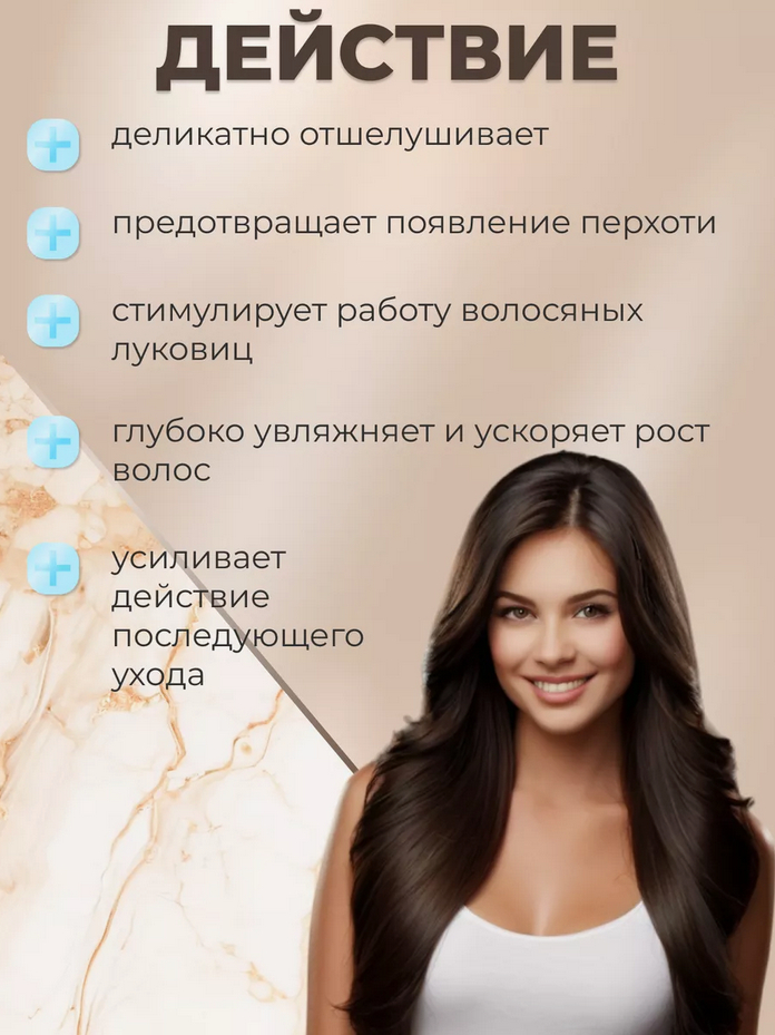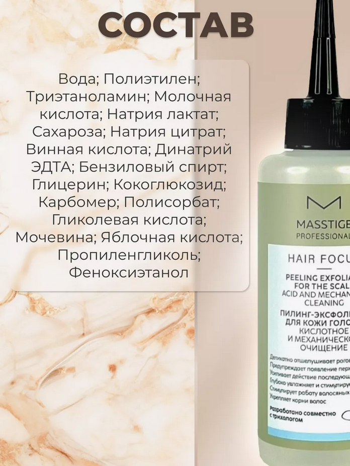 Молочная и гликолевая кислоты активно питают волосяные луковицы, обеспечивая ускорение роста и обновления волос. Винная и яблочная кислоты укрепляют стержни волос, уменьшая их выпадение. Мочевина является отличным увлажнителем, глубоко впитывает влагу в кожу и волосы, устраняет шелушение, дискомфорт, раздражения и зуд, создает защитный барьер, предотвращает образование перхоти.
