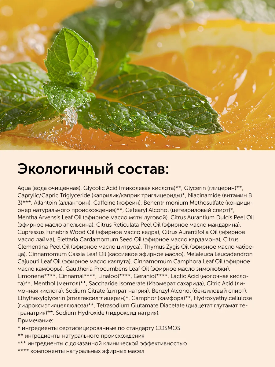 Aqua, Glycolic Acid, Glycerin, Caprylic/Capric Triglyceride, Niacinamide, Allantoin, Caeine, Behentrimonium Methosulfate, Cetearyl Alcohol, Mentha Arvensis Leaf Oil, Citrus Aurantium Dulcis Peel Oil, Citrus Reticulata Peel Oil, Cupressus Funebris Wood Oil, Citrus Aurantifolia Oil, Elettaria Cardamomum Seed Oil, Citrus Clementina Peel Oil,Thymus Zygis Oil, Cinnamomum Cassia Leaf Oil, Melaleuca Leucadendron Cajuputi Leaf Oil, Cinnamomum Camphora Leaf Oil, Gaultheria Procumbens Leaf Oil, Limonene*, Cinnamal*, Linalool*, Geraniol*, Lactic Acid, Menthol, Saccharide Isomerate, Citric Acid, Sodium Citrate, Benzyl Alcohol, Ethylhexylglycerin, Camphor, Hydroxyethylcellulose, Tetrasodium Glutamate Diacetate, Sodium Hydroxide.