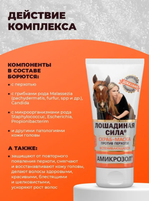 Скраб-маска включает в себя уникальный активный комплекс Амикрозол, содержащий противомикробные компоненты, в синергии с купажем натуральных растительных масел. Комплекс Амикрозол разработан для эффективного устранения перхоти, вызванной грибками рода Malassezia (pachydermatis, furfur, spp и др.), Candida и микроорганизмами рода Staphylococcuc, Escherichia, Propionibacterim и других патологий кожи головы. Уменьшает гиперкератоз, регулирует работу сальных желез, борется с проявлениями себорейных дерматитов.