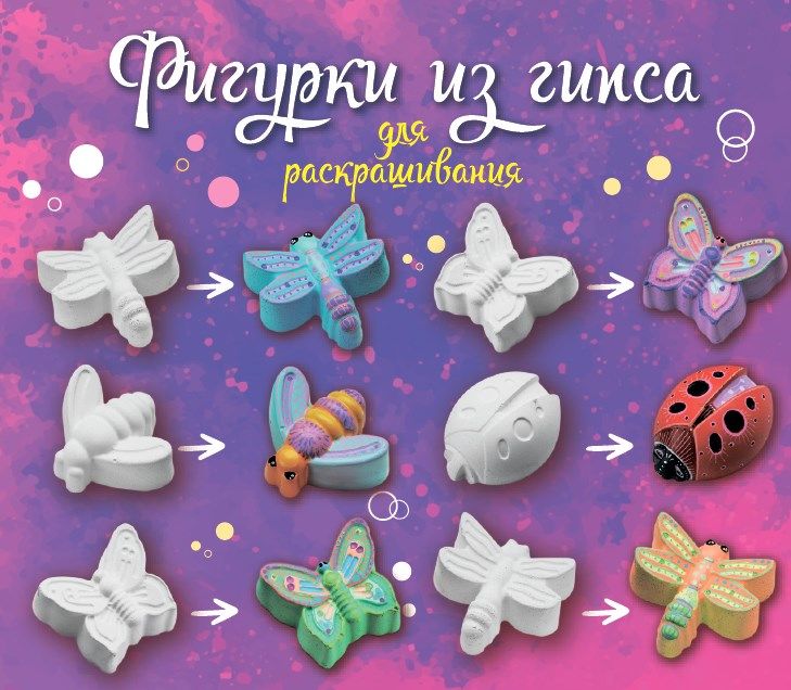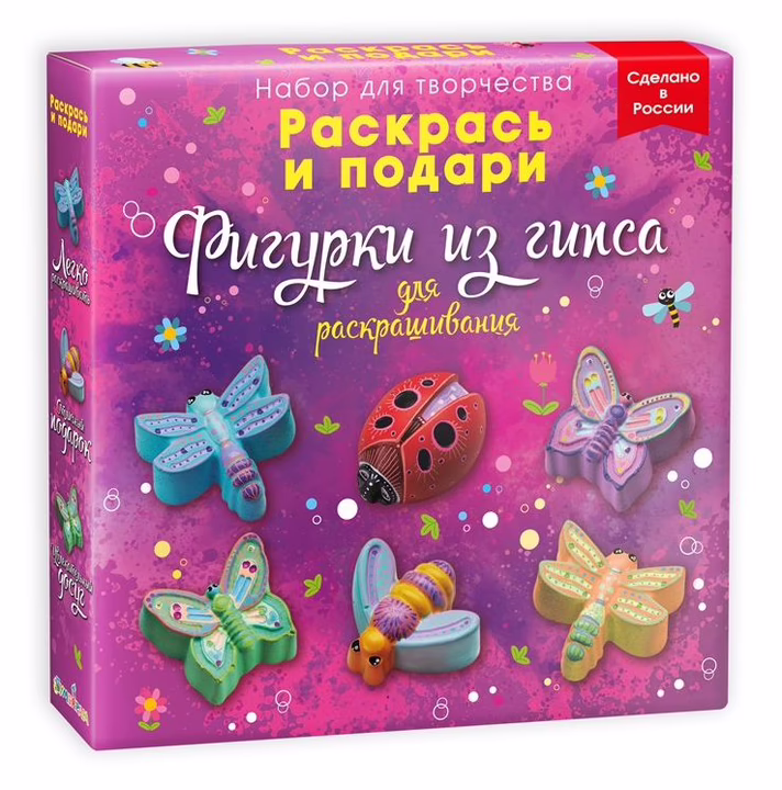 В этом наборе вы найдете шесть гипсовых фигурок в форме милых насекомых. Фигурки выполнены с высокой точностью и выглядят очень реалистично после раскрашивания, смело выбирайте яркие цвета для бабочек и стрекоз! Готовые фигурки будут напоминать о лете и станут отличным подарком близким.