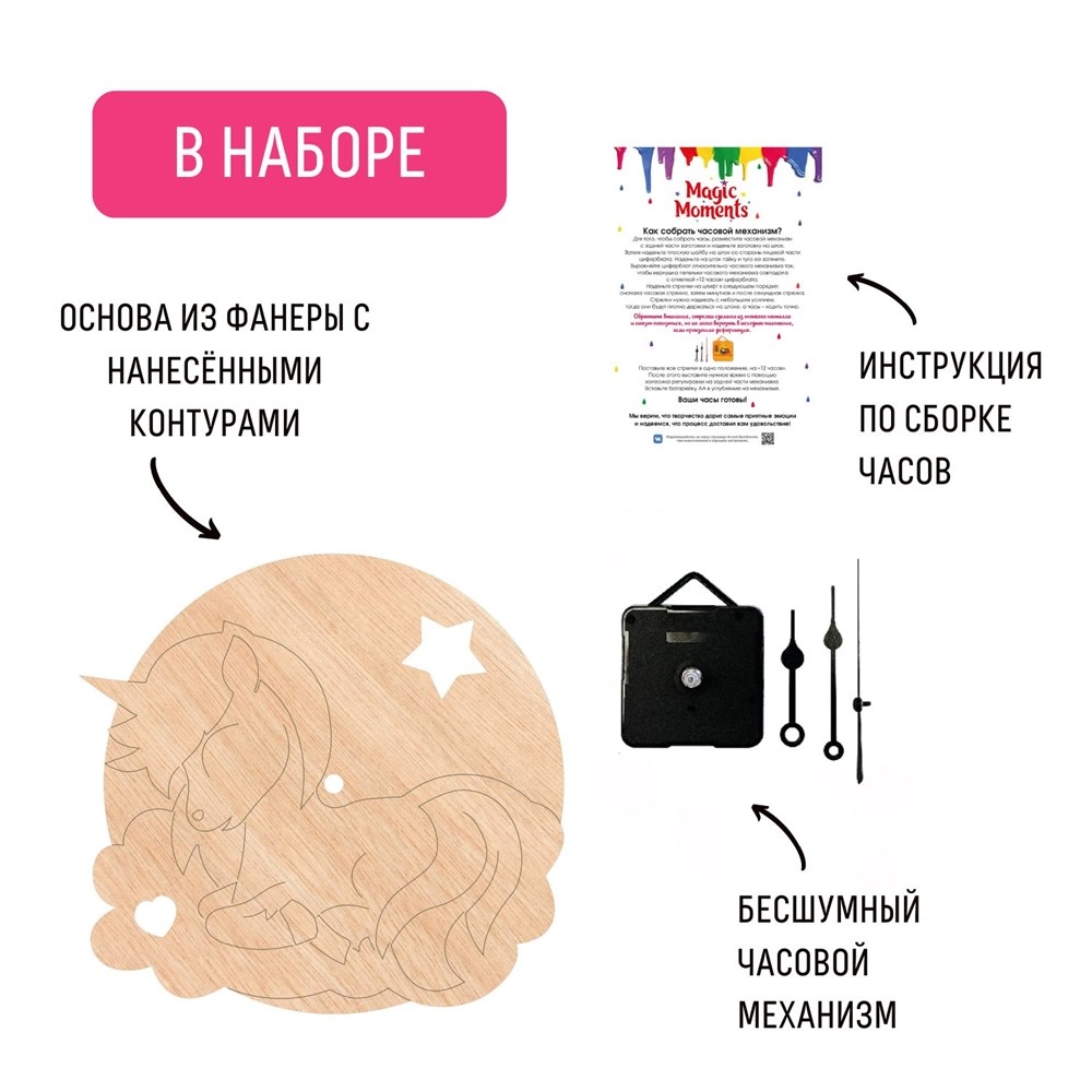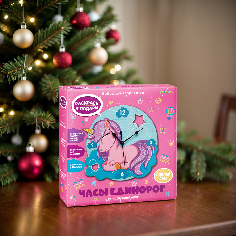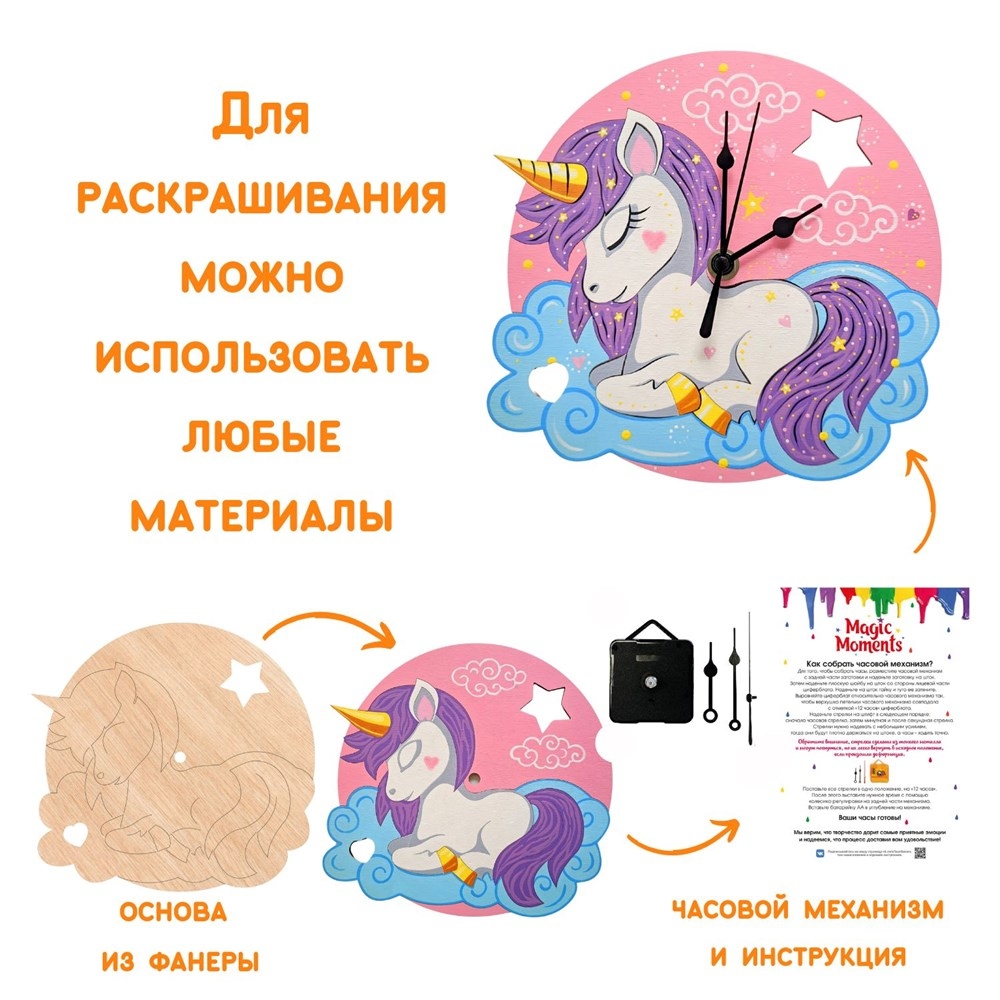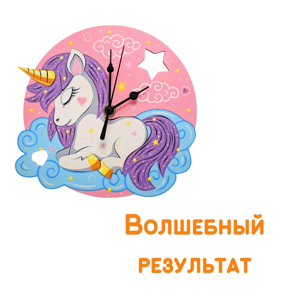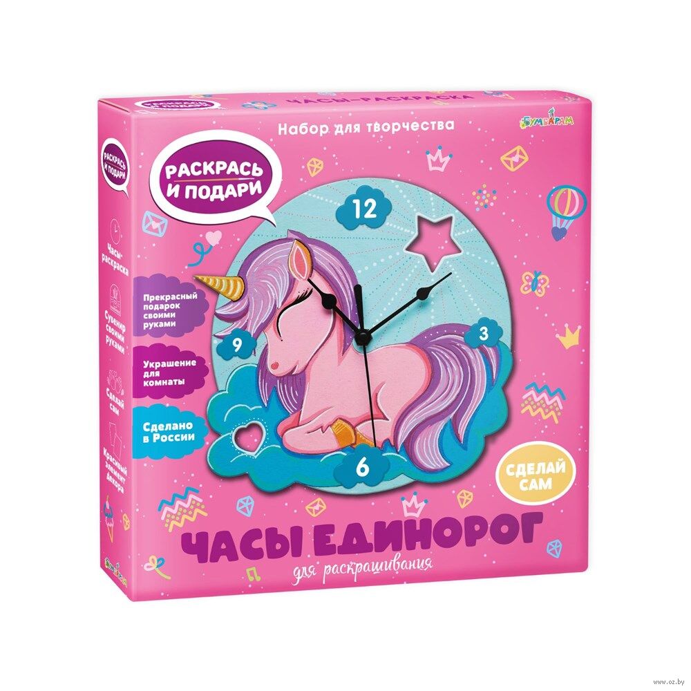 Чтобы создать собственные часы, совсем не обязательно учиться на часовщика. Возьмите набор для творчества "Чудесный единорог" и просто следуйте инструкции из комплекта. Помимо неё в коробке вы найдете заготовку и часовой механизм. Для начала раскрасьте основу часов, используя любые материалы – можете придумать свой дизайн или повторить рисунок на коробке. Теперь осталось присоединить часовой механизм и стрелки, а затем украсить новыми часами комнату.