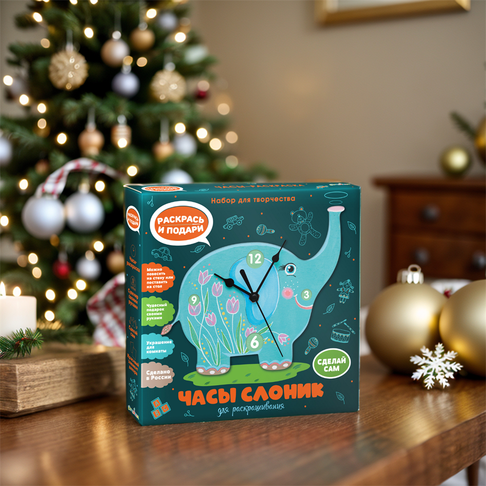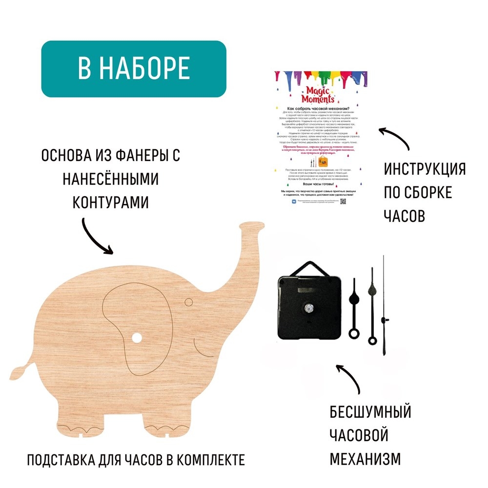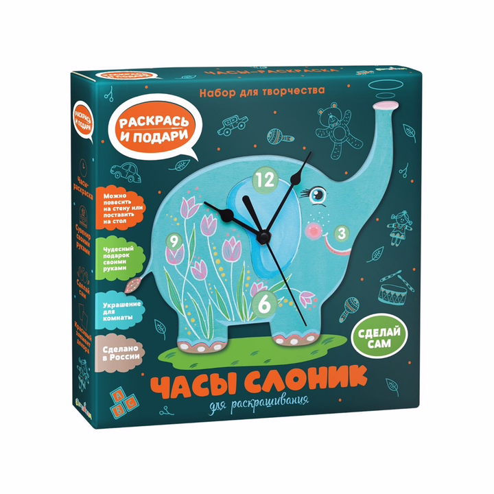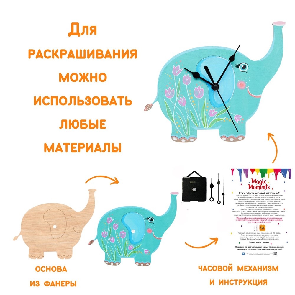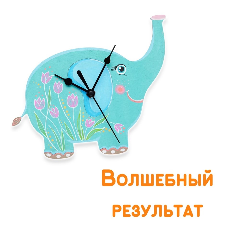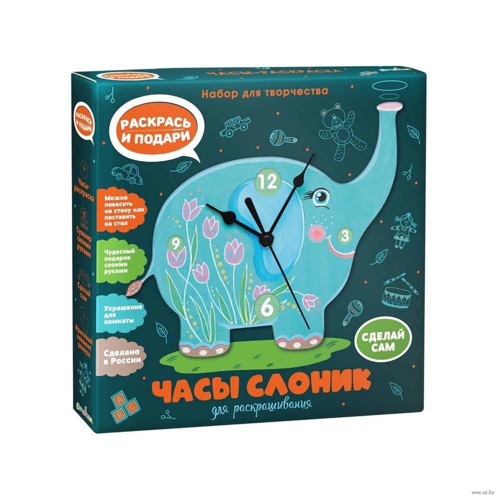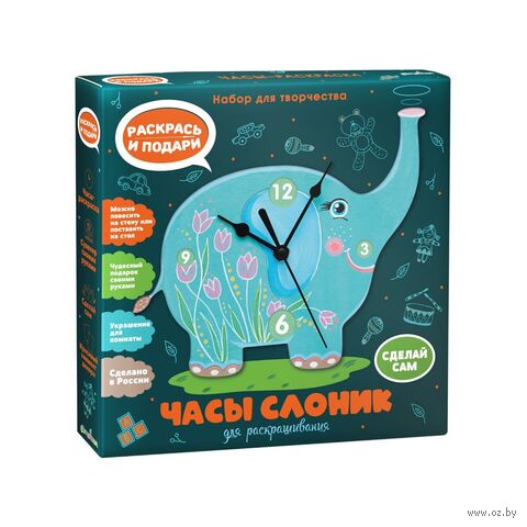 Известно, что слоны приносят удачу. Поселить у себя дома милого слонёнка – можно! Это возможно благодаря набору для творчества «Слоник» с часами-раскраской. Сделать собственные часы просто. Раскрасьте заготовку, используя любые материалы, и присоедините к ней часовой механизм со стрелками. В инструкции из комплекта подробно указано, как это сделать. Вы можете повесить часы в форме слоника на стену или поставить на стол – в наборе есть специальные подставки.