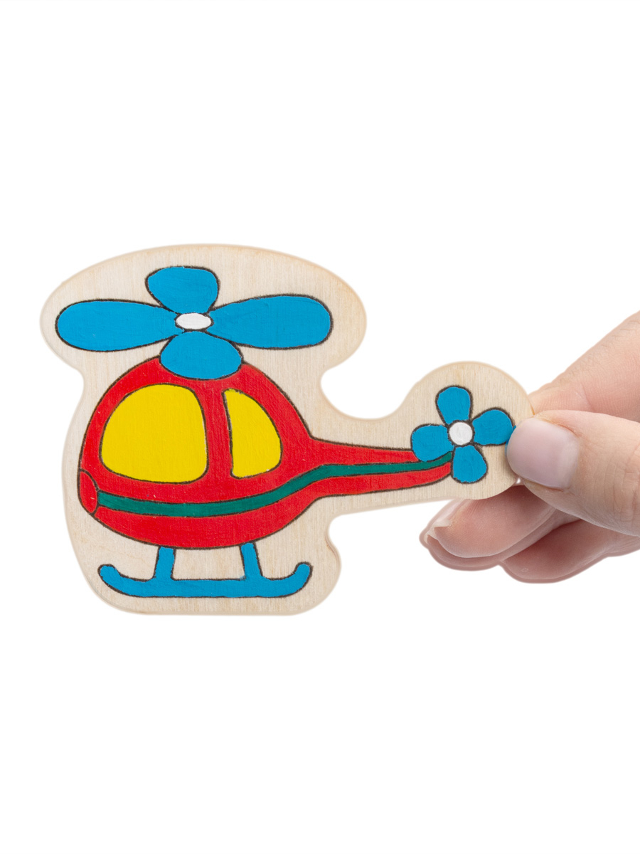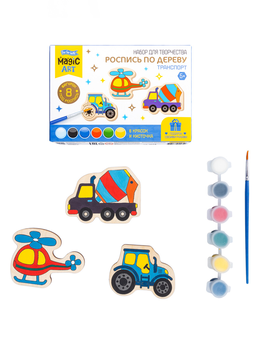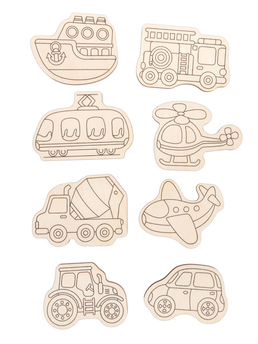 Набор Роспись по дереву "Транспорт" – это 8 фигурок из древесного материала: вертолет, самолет, трактор, легковой автомобиль, пожарная машина, бетономешалка, трамвай и корабль, которые нужно раскрасить. Все необходимое для творчества входит в набор!