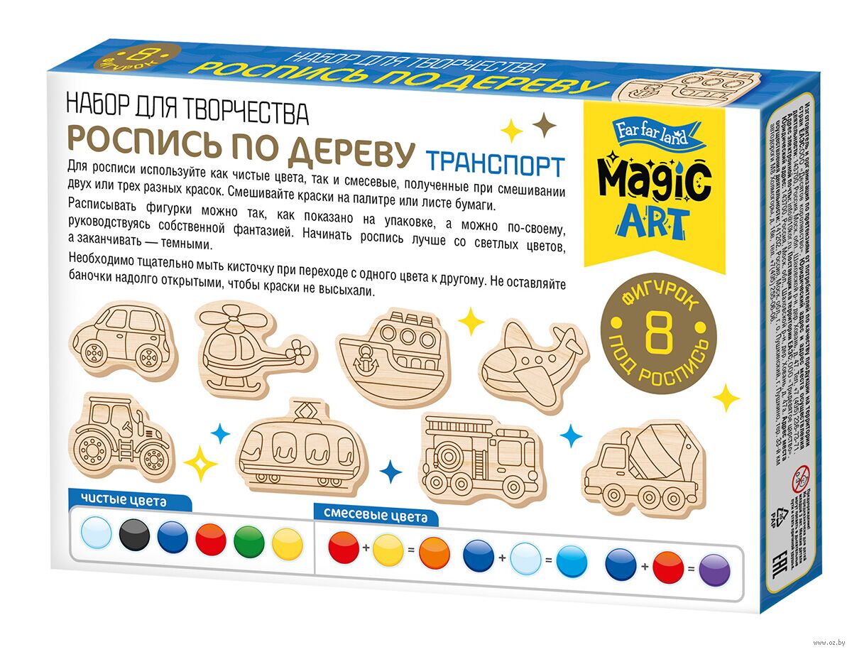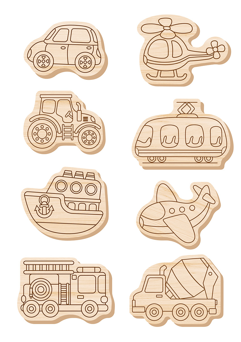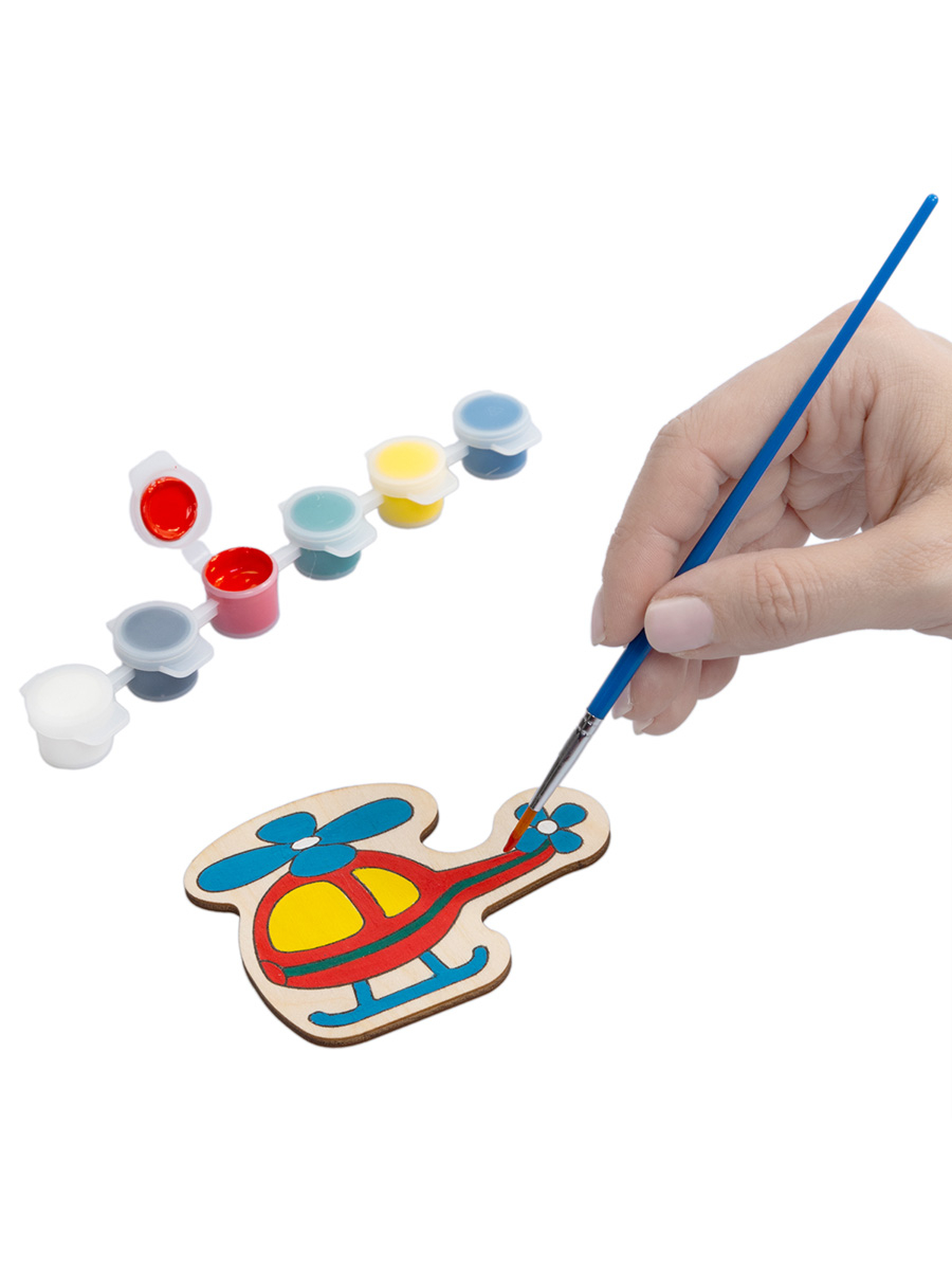 Набор Роспись по дереву "Транспорт" – это 8 фигурок из древесного материала: вертолет, самолет, трактор, легковой автомобиль, пожарная машина, бетономешалка, трамвай и корабль, которые нужно раскрасить. Все необходимое для творчества входит в набор!