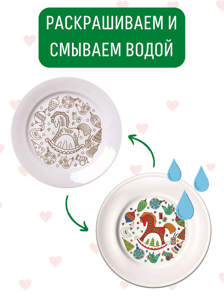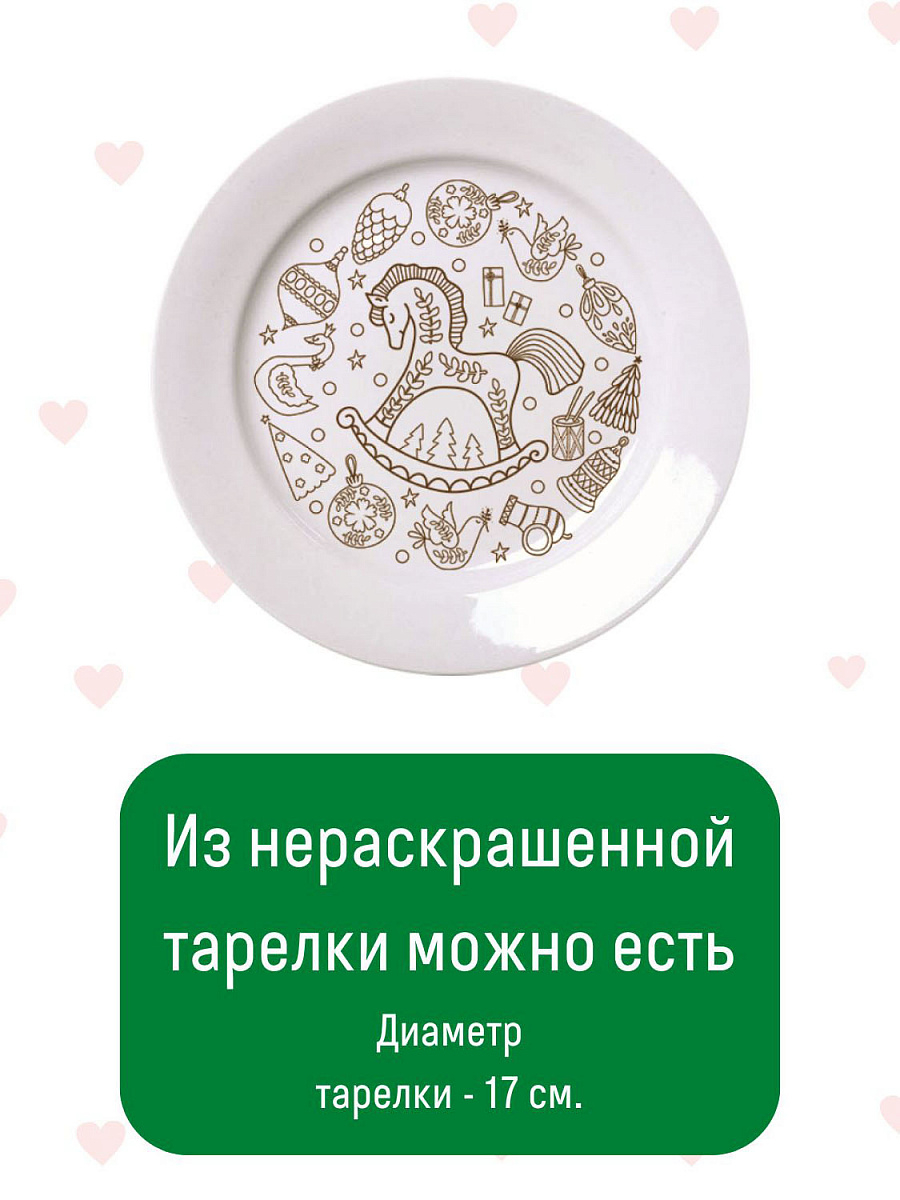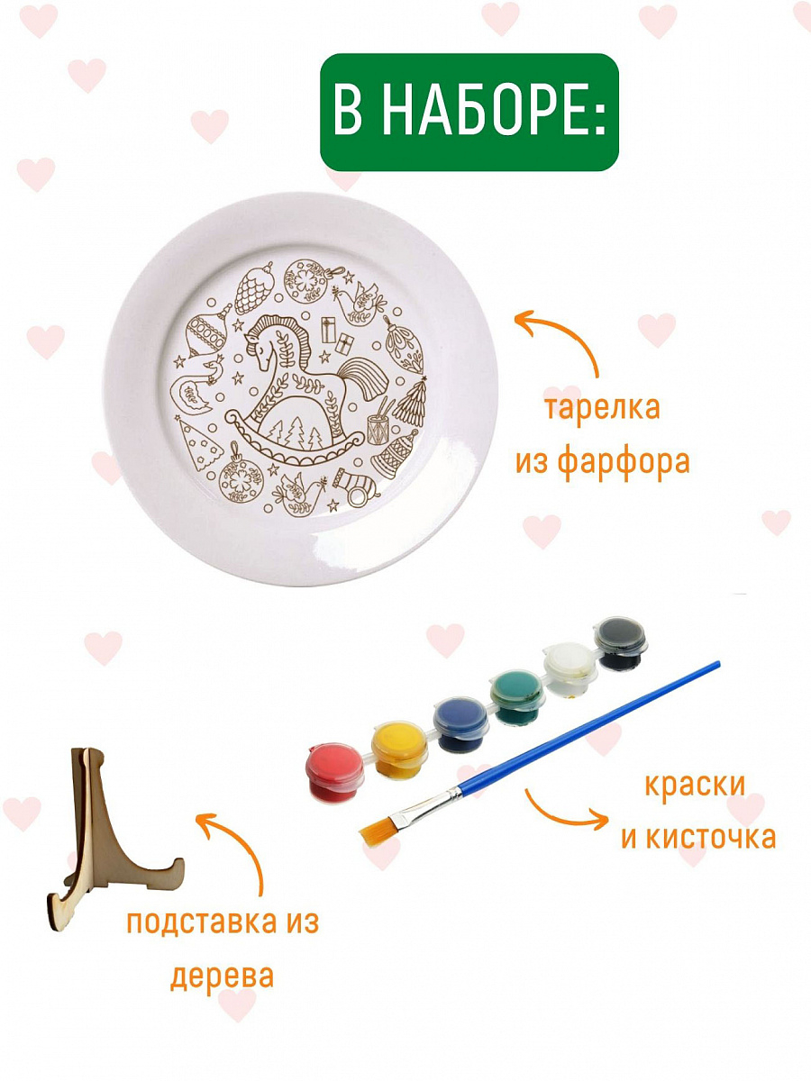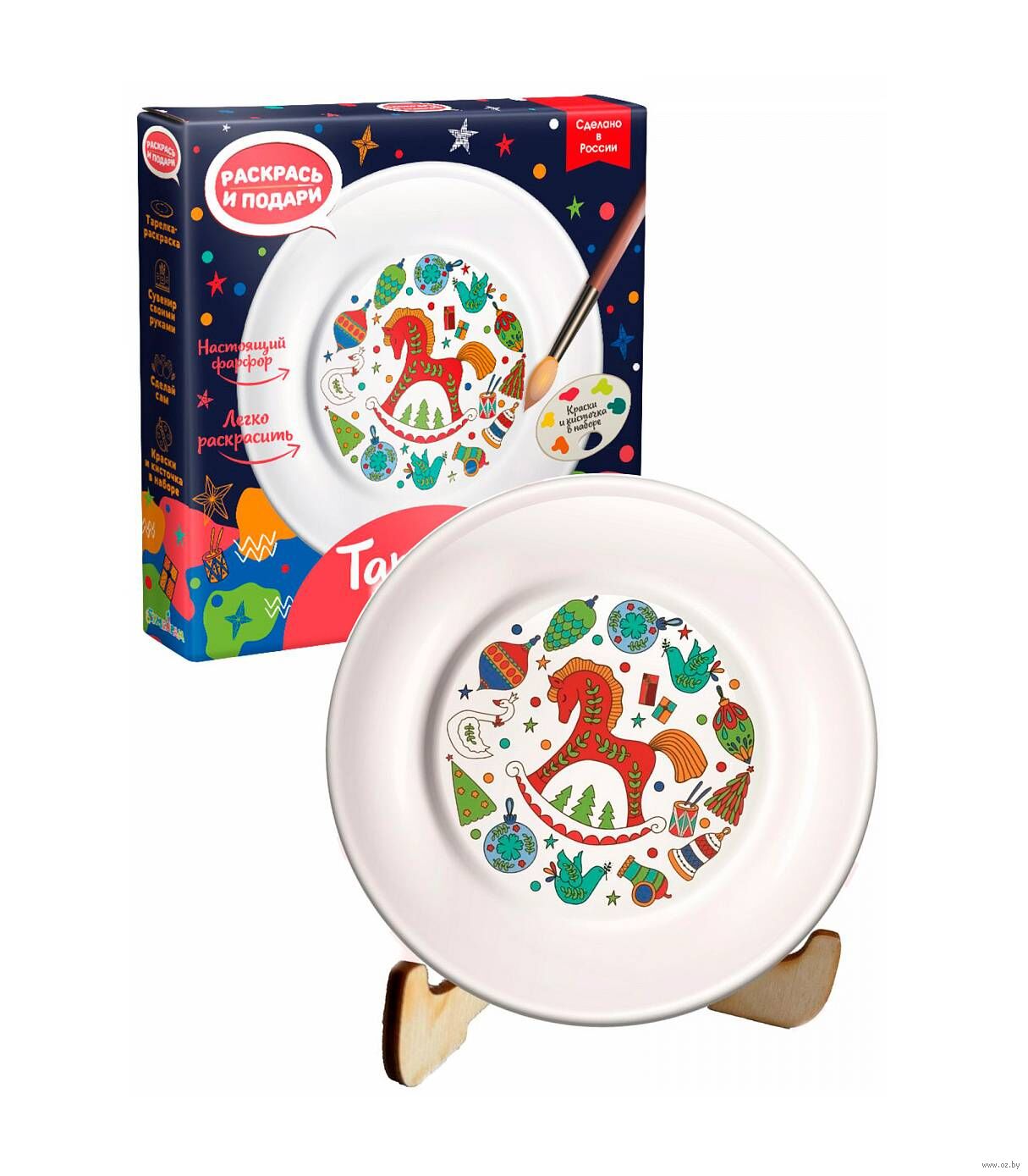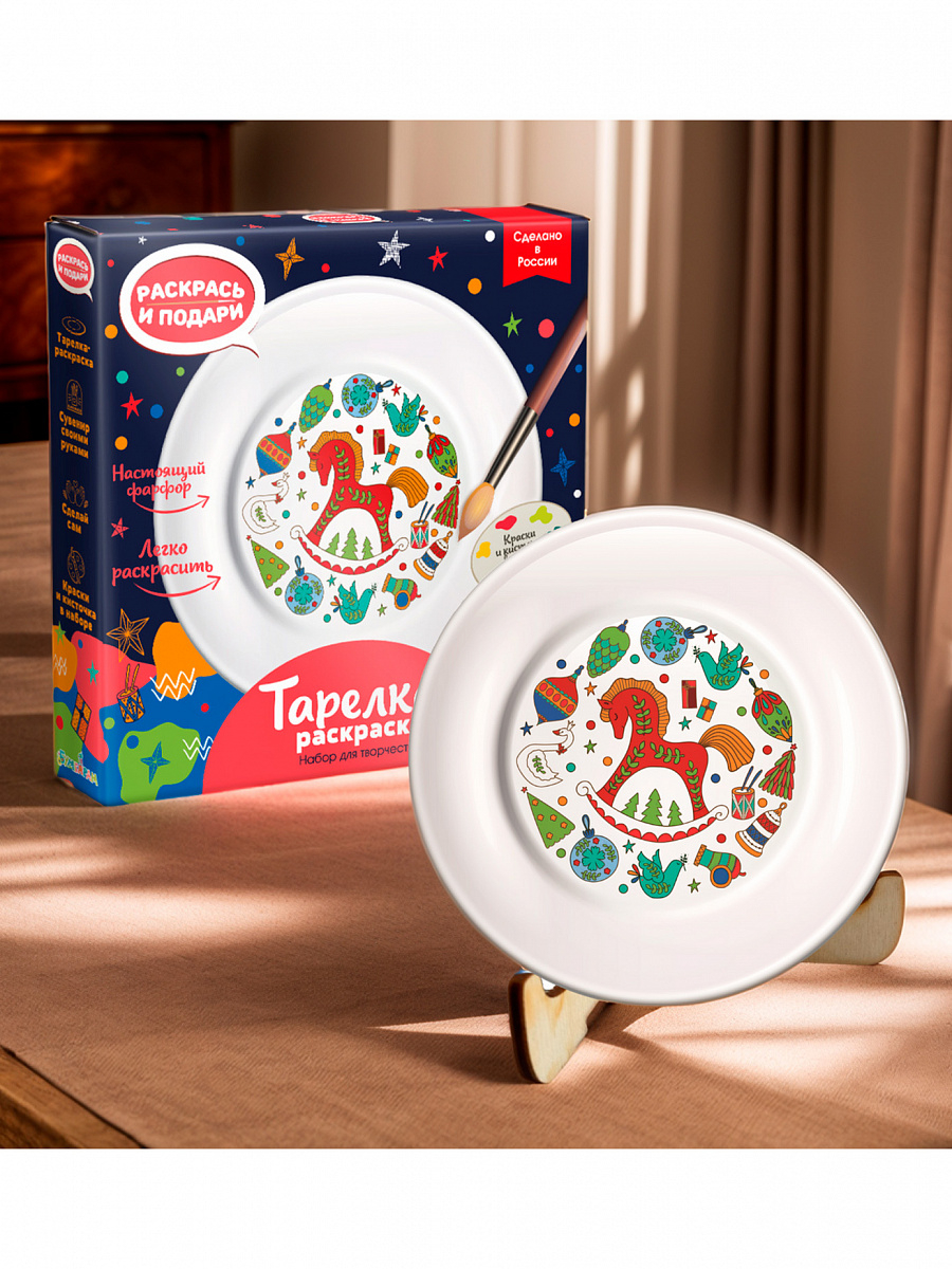 Такой набор станет замечательным новогодним подарком для близких. В комплекте есть всё необходимое для создания красивой декоративной посуды: краски, кисточка, сама тарелка и деревянная подставка.