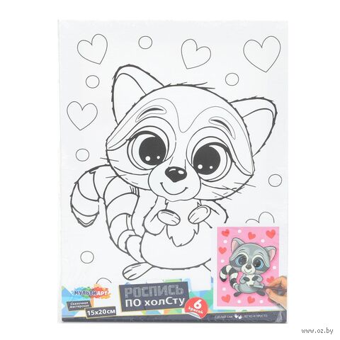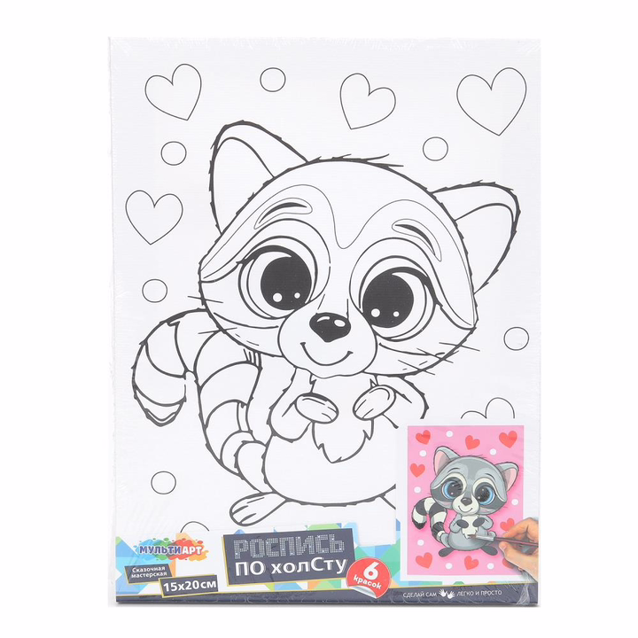 Ребёнок увлекательно и с пользой проведёт время, расписывая холст с изображением очаровательного енота. Подбирать цвета можно по собственному желанию или используя образец на упаковке.