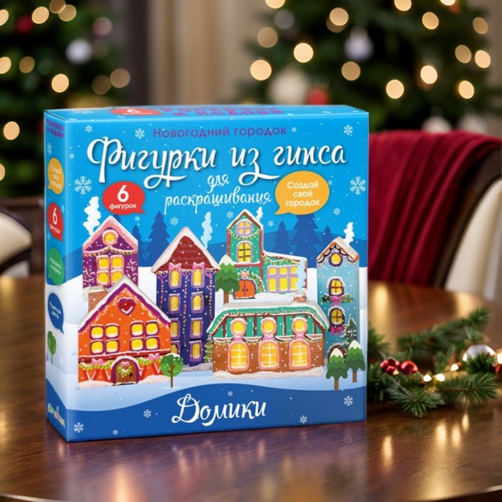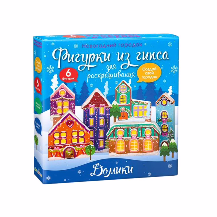 Погрузитесь в атмосферу праздника с новым набором для творчества, который позволит вам создать яркий новогодний декор. В яркой коробке вы найдёте гипсовые заготовки в форме домиков. В наборе нет двух одинаковых домиков. Краски легко ложатся на поверхность гипса, так что даже начинающим художникам будет просто добиться красивого результата. Раскрашивать домики можно по собственному вкусу или повторить рисунок с упаковки. Смело придумывайте, каким будет ваш городок и кто в нём будет жить, ограничений для фантазии нет.