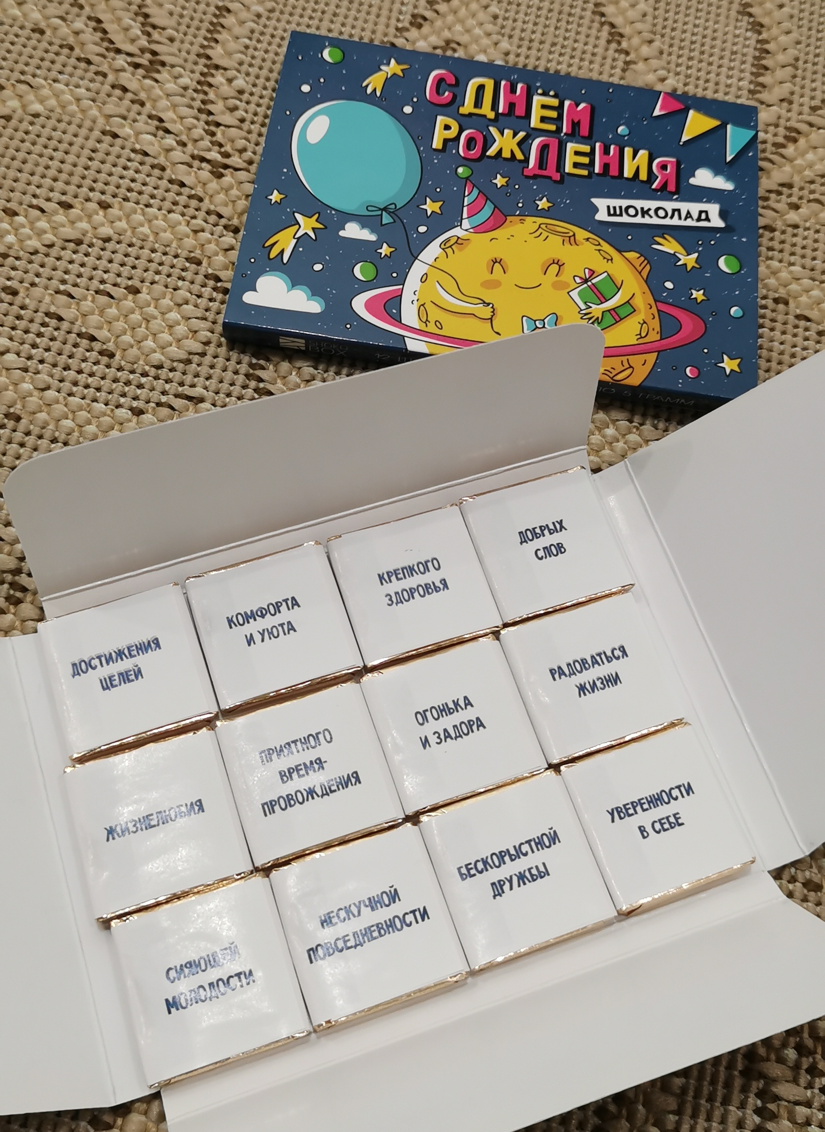 Прикольный подарок на день рождения! Смешные пожелания на каждой шоколадке внутри.