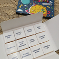 Отличная замена открытке к подарку. На обратной стороне каждой шоколадки короткое пожелание. Интересно и не банально.