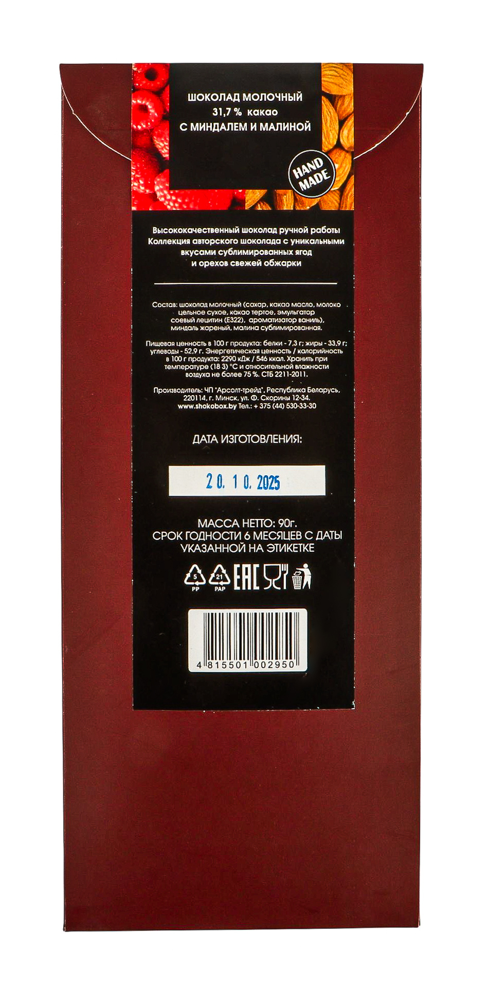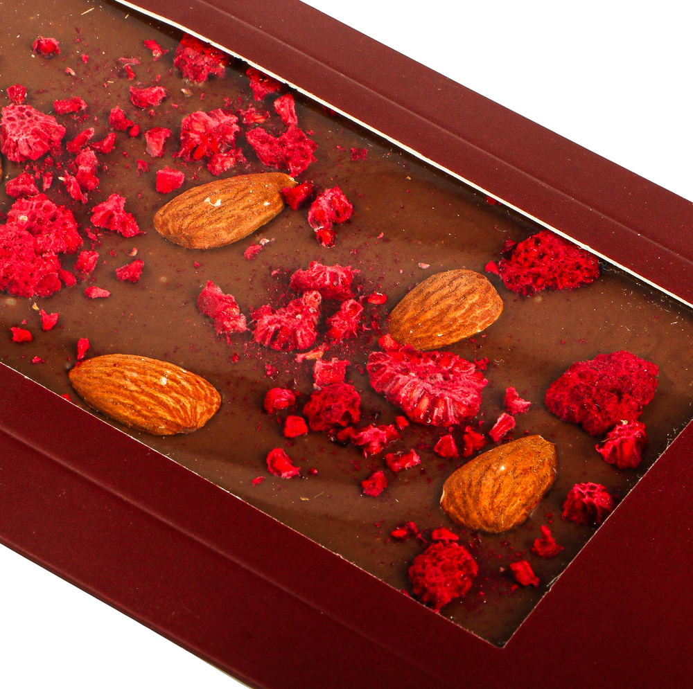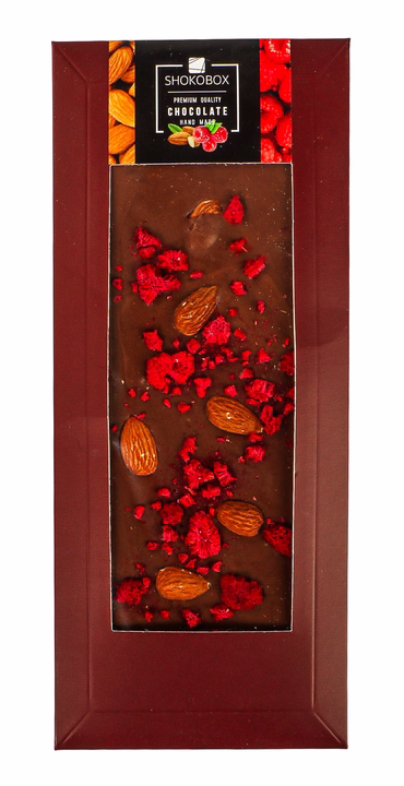 Крафт-шоколадка из молочного шоколада с миндалем и малиной.