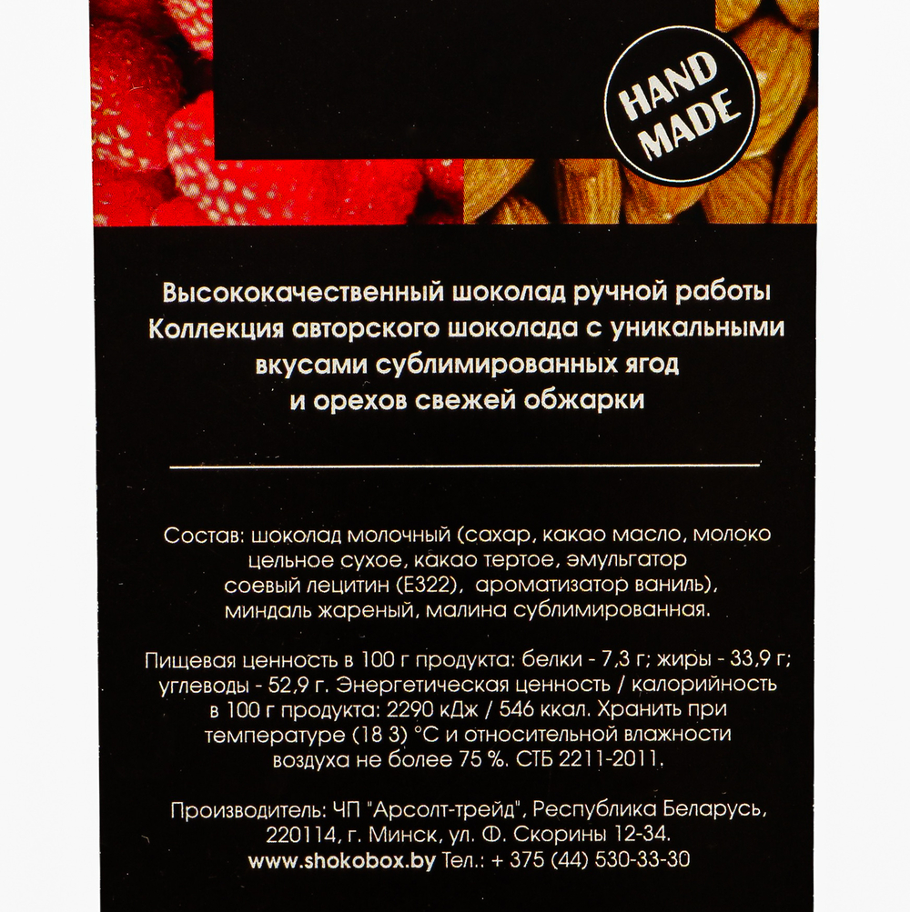 Шоколад молочный (сахар, какао масло, молоко цельное сухое, какао тертое, эмульгатор соевый лецитин (Е322), ароматизатор ваниль), миндаль жареный, малина сублимированная.