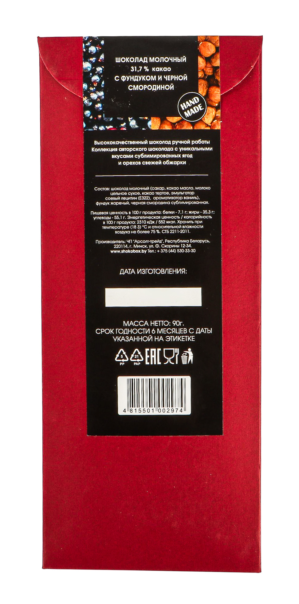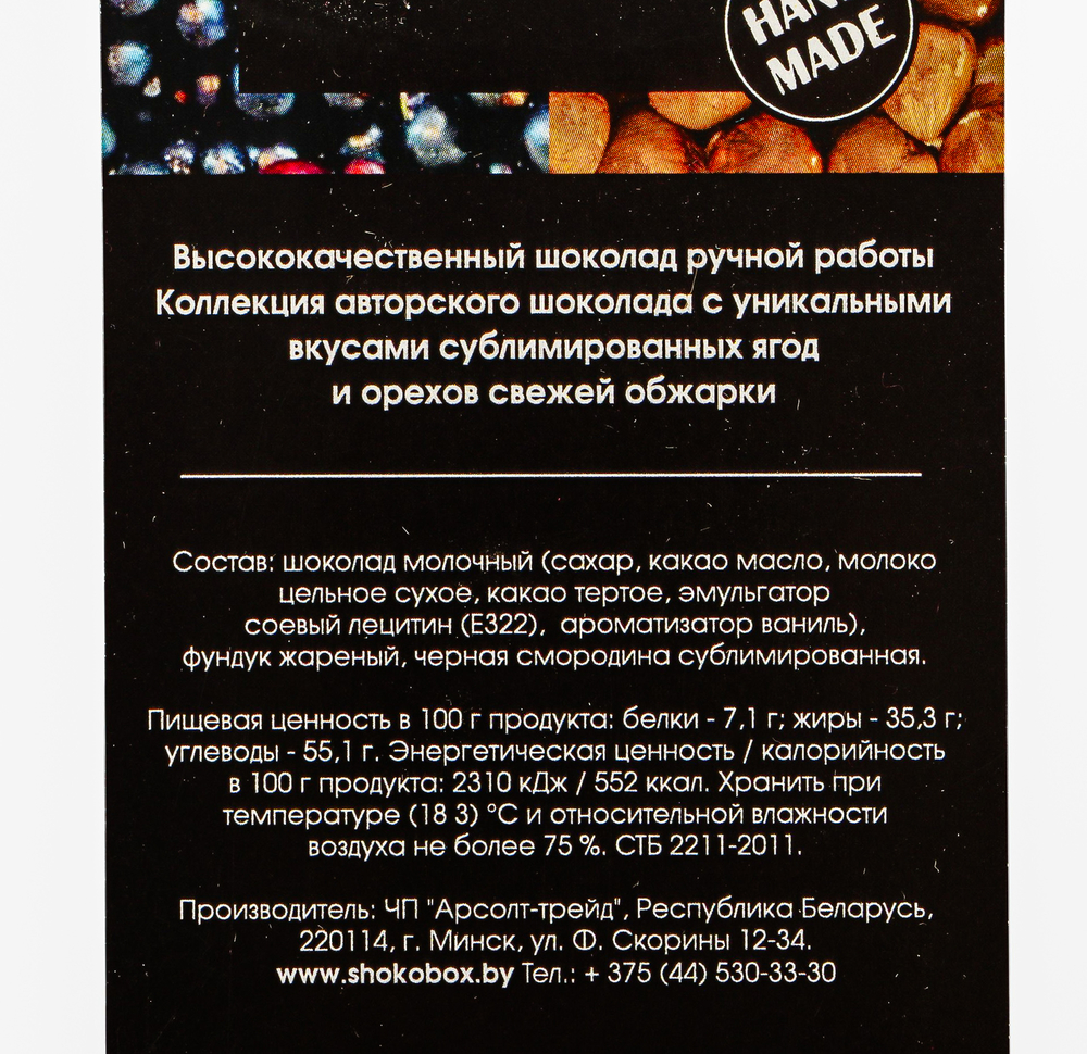 Шоколад молочный (сахар, какао масло, молоко цельное сухое, какао тертое, эмульгатор соевый лецитин (Е322), ароматизатор ваниль), фундук жареный, черная смородина сублимированная.