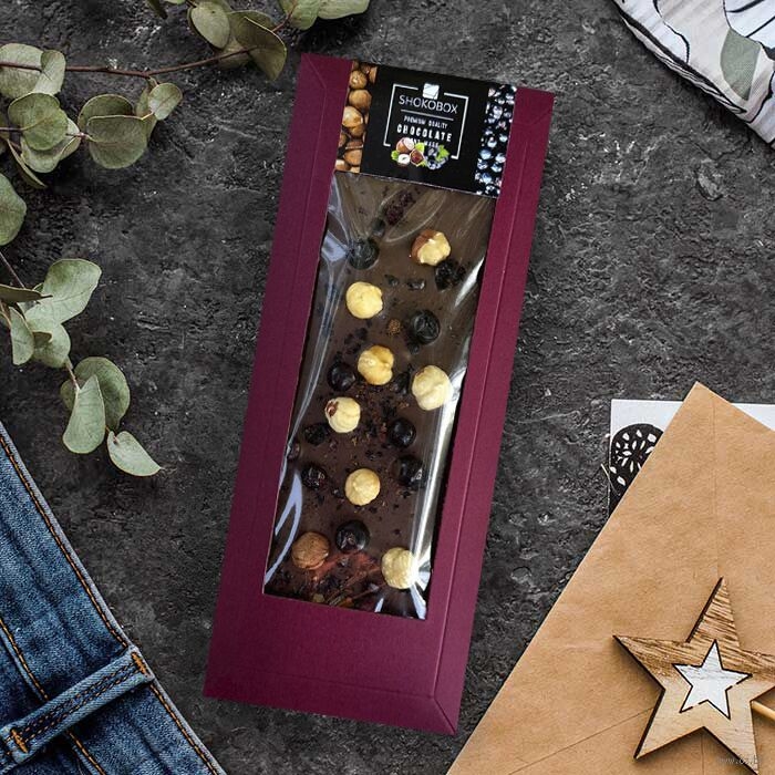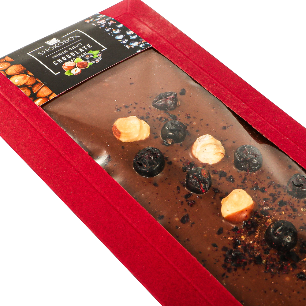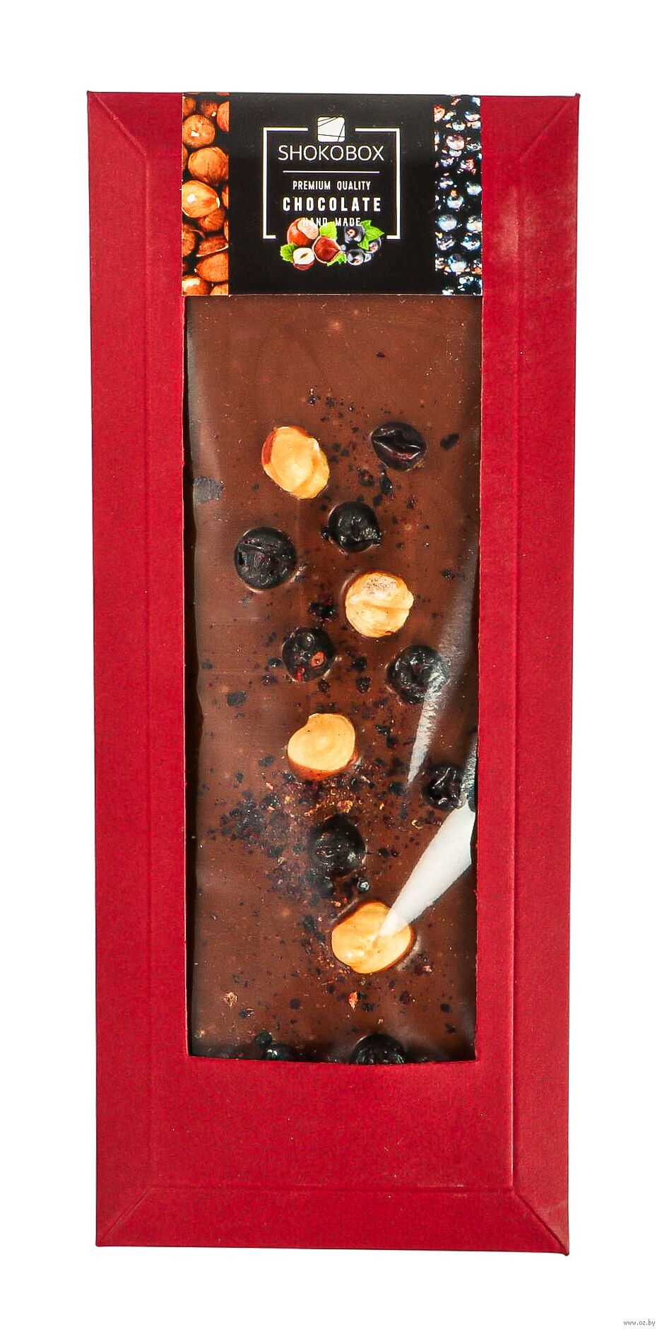 Крафт-шоколадка из молочного шоколада с фундуком и черной смородиной.