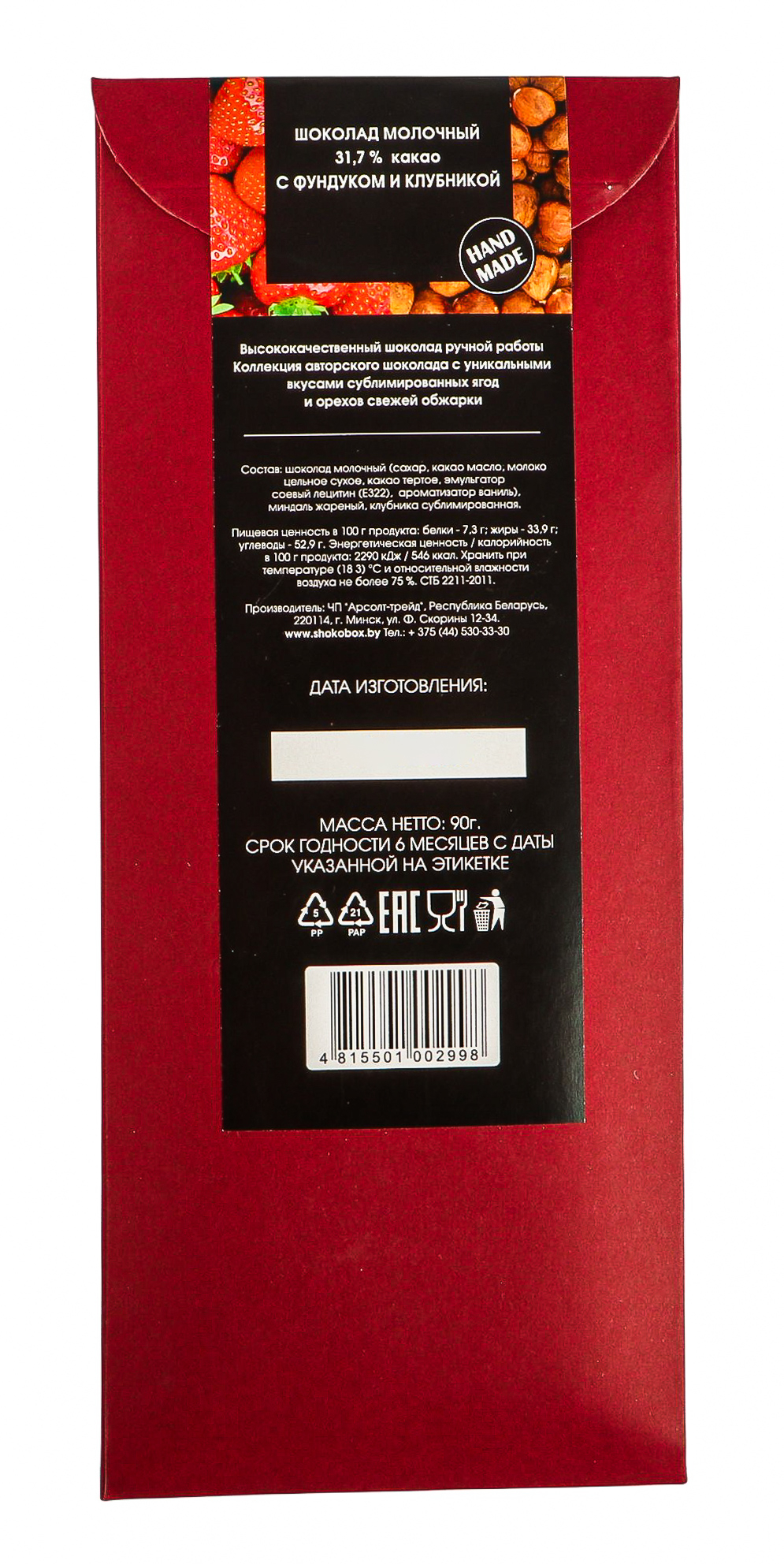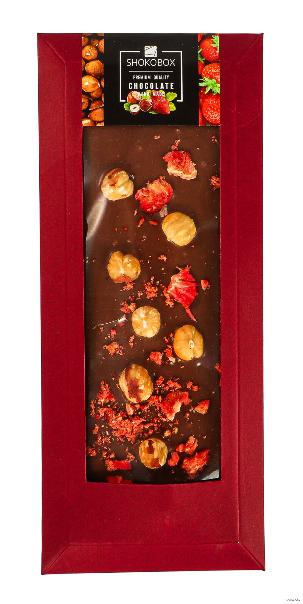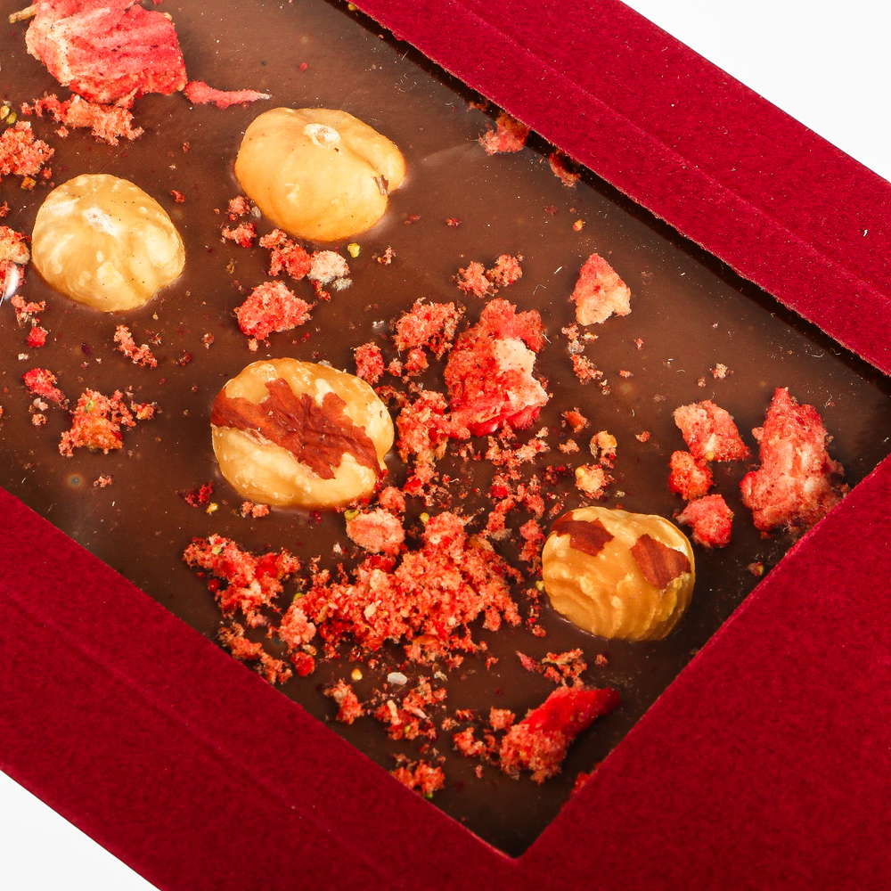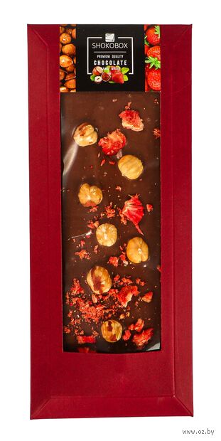 Шоколад молочный (сахар, какао масло, молоко цельное сухое, какао тертое, эмульгатор соевый лецитин (Е322), ароматизатор ваниль), фундук жареный, клубника сублимированная.
