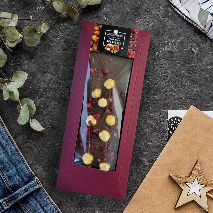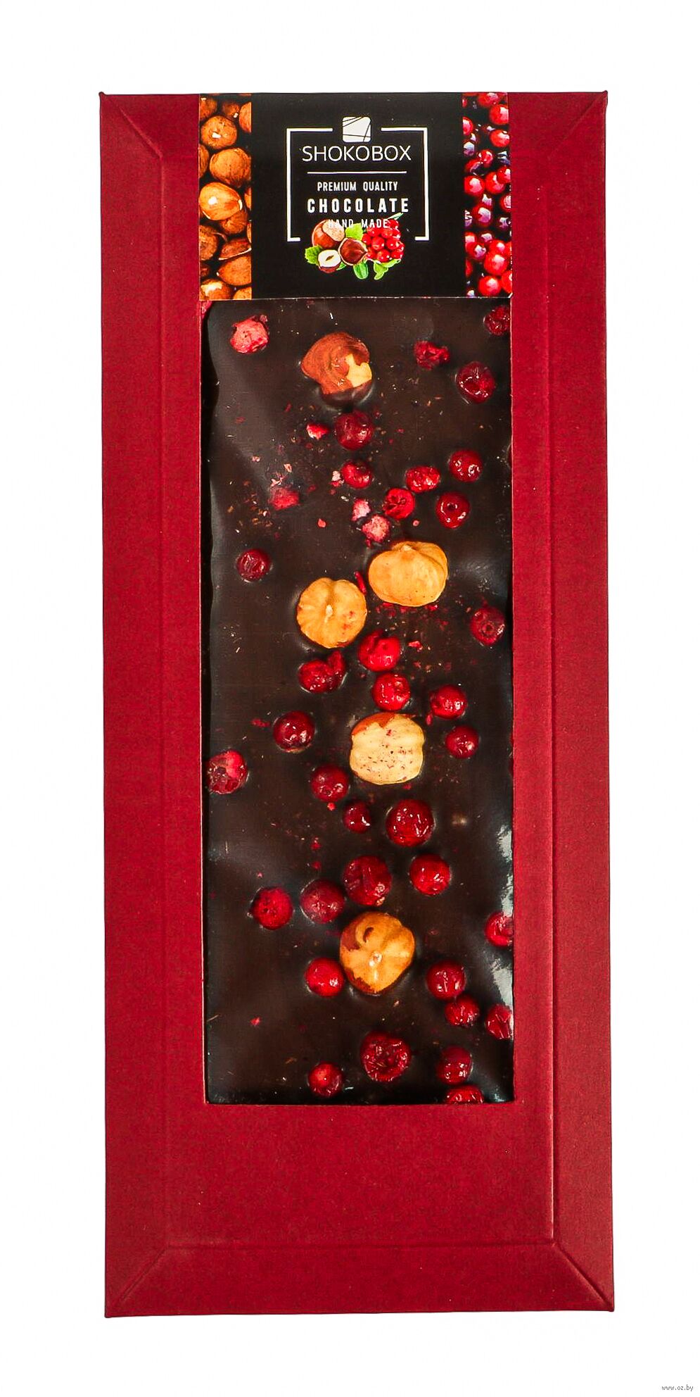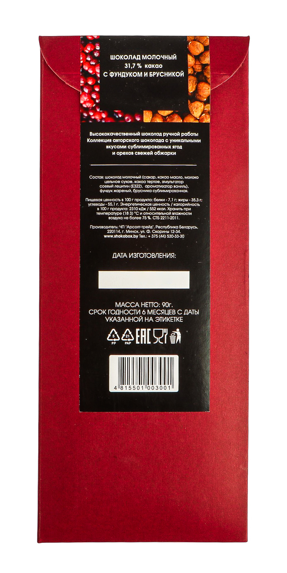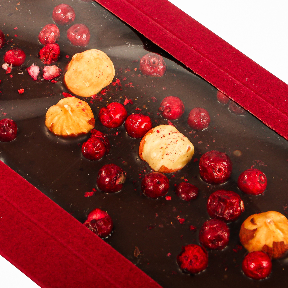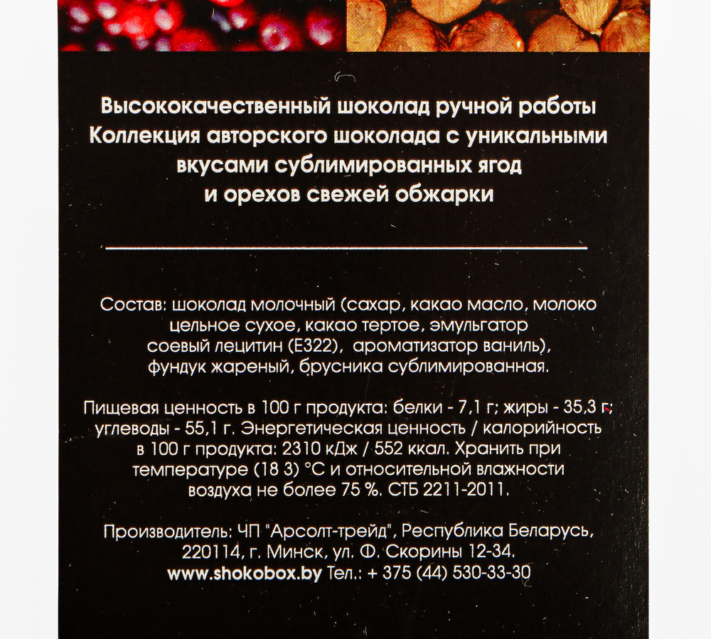 Шоколад молочный (сахар, какао масло, молоко цельное сухое, какао тертое, эмульгатор соевый лецитин (Е322), ароматизатор ваниль), фундук жареный, брусника сублимированная.