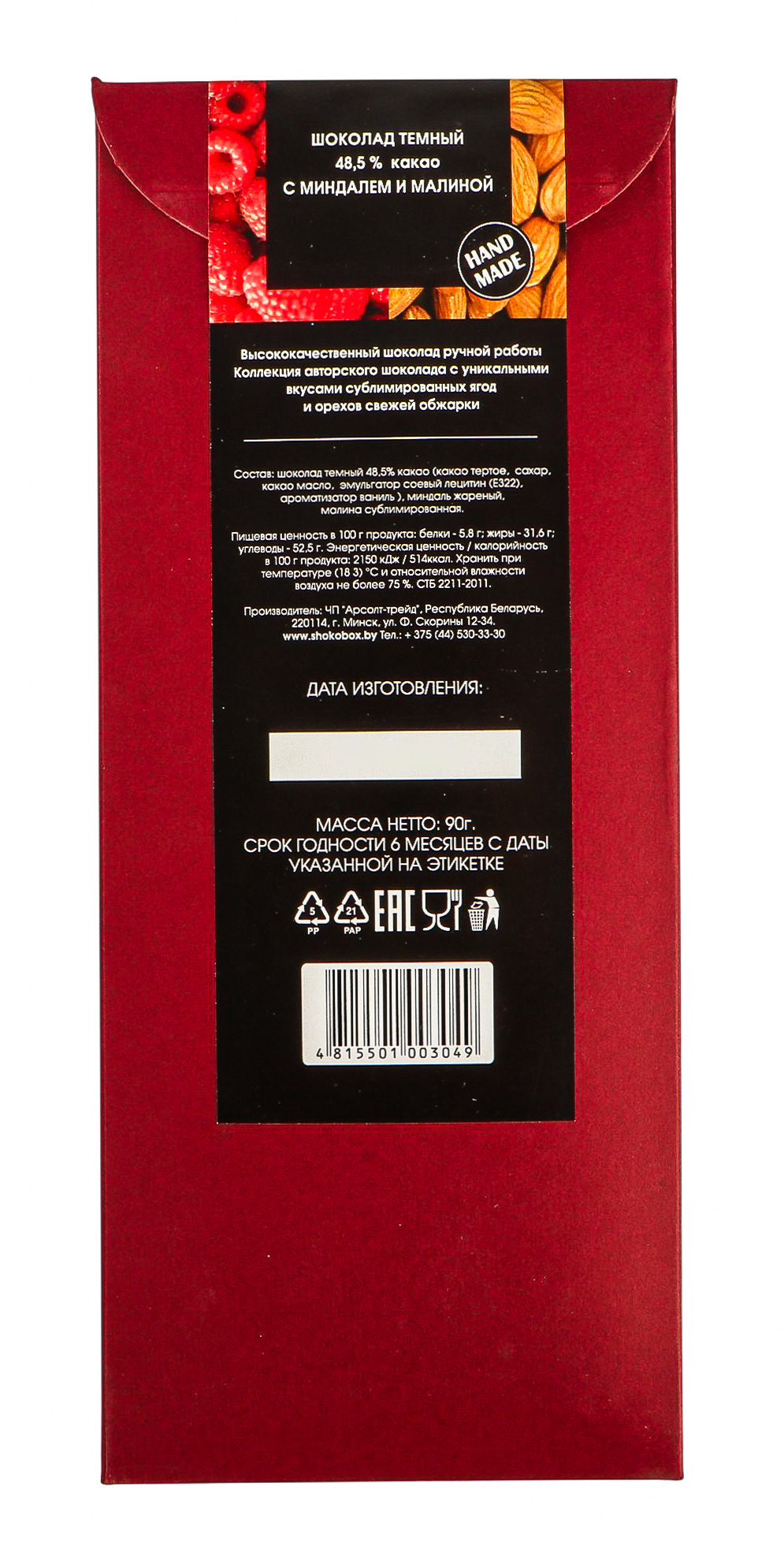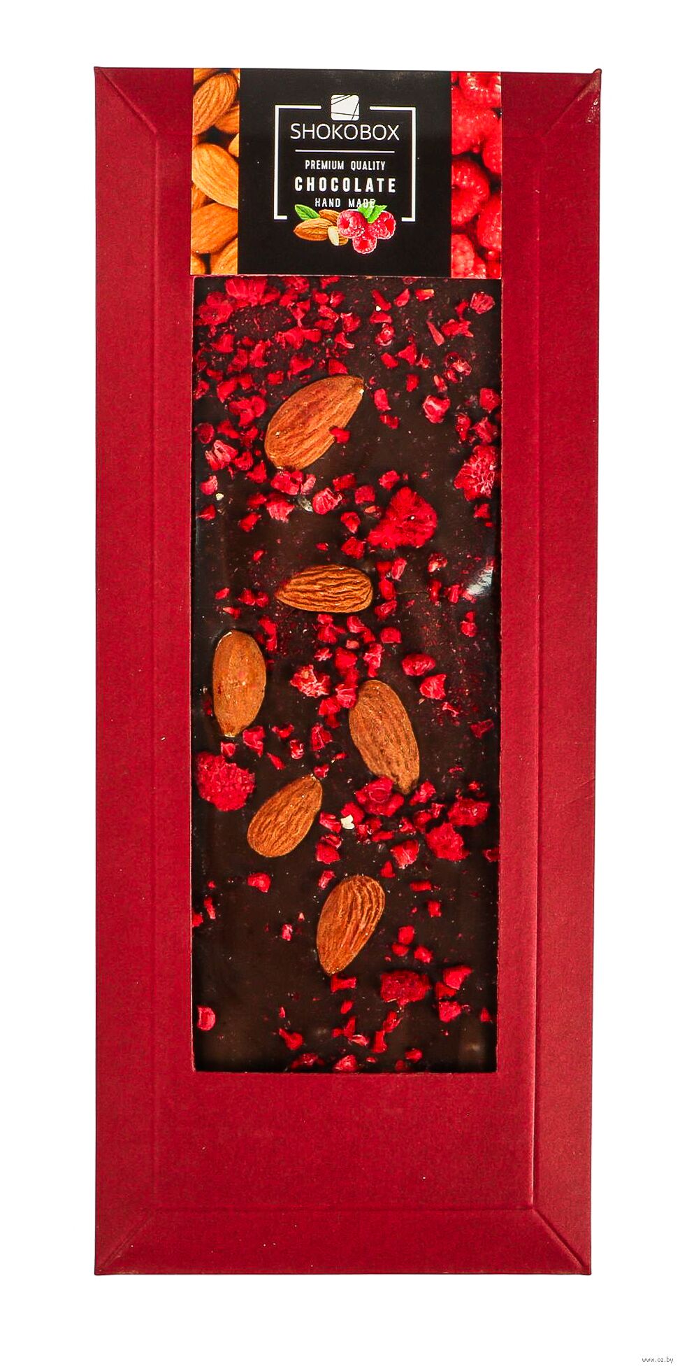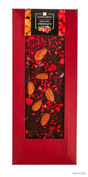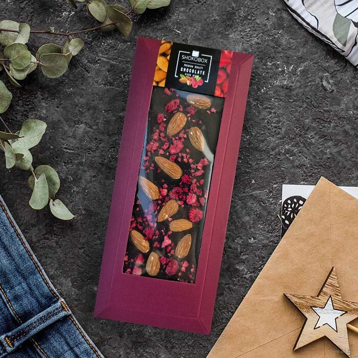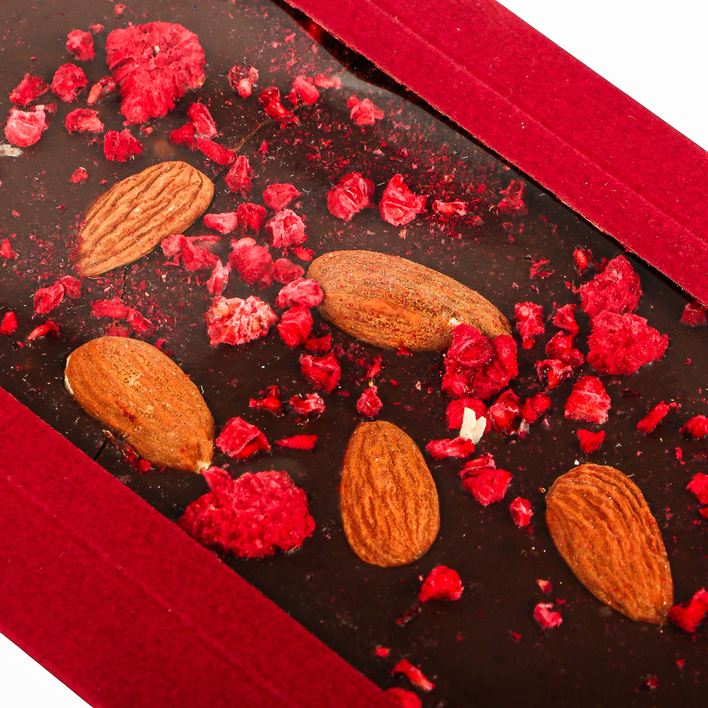 Крафт-шоколадка из темного шоколада с миндалем и малиной.