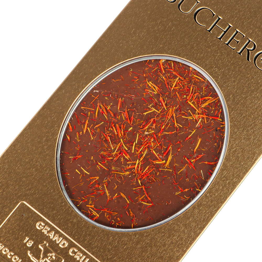 Молочный шоколад с соленой карамелью, васильком и шафраном нежно тает во рту и оставляет пряно-цветочное послевкусие.