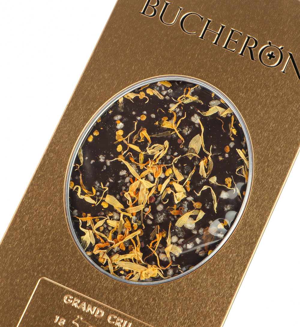 Имбирь, гранулы меда, цветочная пыльца, лепестки василька и календулы стимулируют иммунитет, подчеркивают интенсивный аромат свежеобжаренных какао-бобов, создавая гармоничную, слегка пряную композицию.