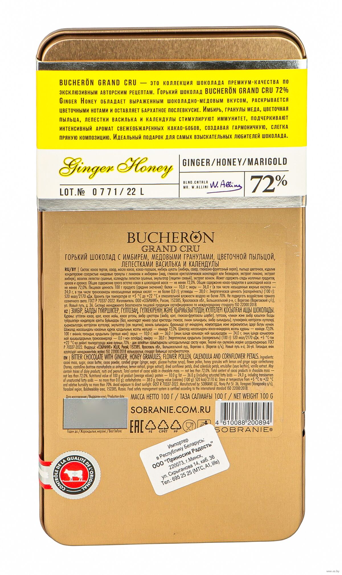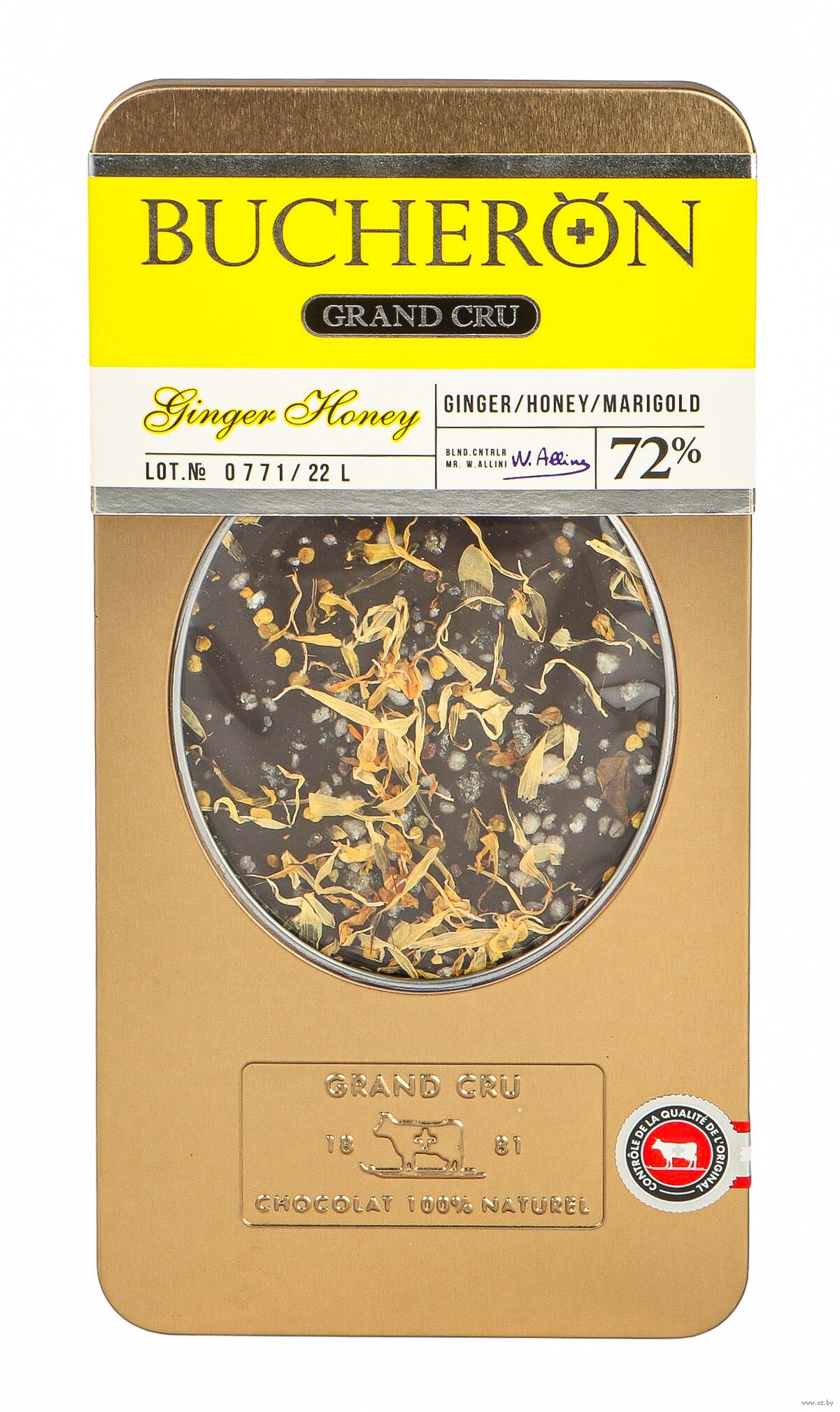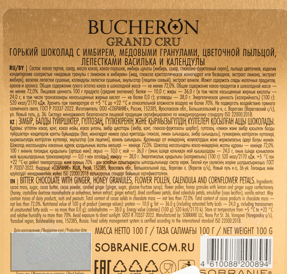 Какао тертое, сахар, масло какао, какао-порошок, имбирь цукаты, цветочная пыльца, медовые гранулы (мед, глюкоза), лепестки василька, лепестки календулы, эмульгатор (лецитин соевый, Е476). Может содержать следы молочных продуктов, других видов орехов и арахиса. Общее содержание сухого остатка какао в шоколадной массе — не менее 72,0%. Общее содержание какао-продуктов в шоколадной массе — не менее 72,0%
