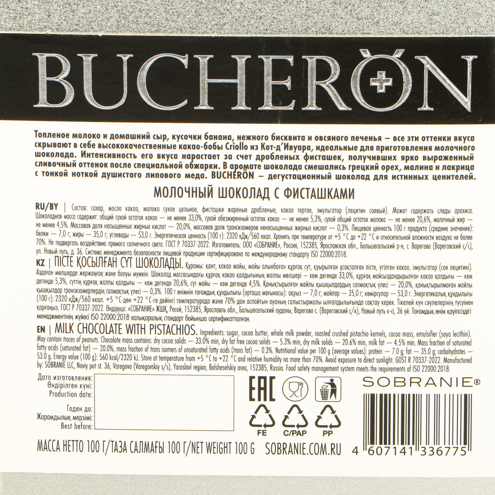 Великолепное сочетание нежного молочного шоколада и ароматных фисташек создает неповторимую вкусовую гармонию, которая удовлетворит даже самых требовательных гурманов. В каждой плитке шоколада скрыта магия высокого качества и натуральных ингредиентов, которые дарят непревзойденные вкусовые ощущения.