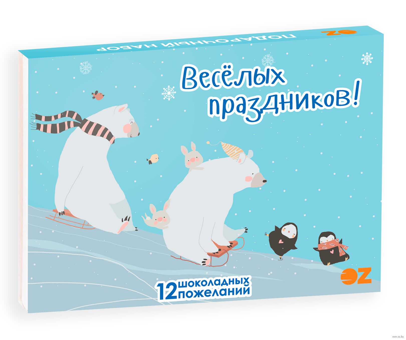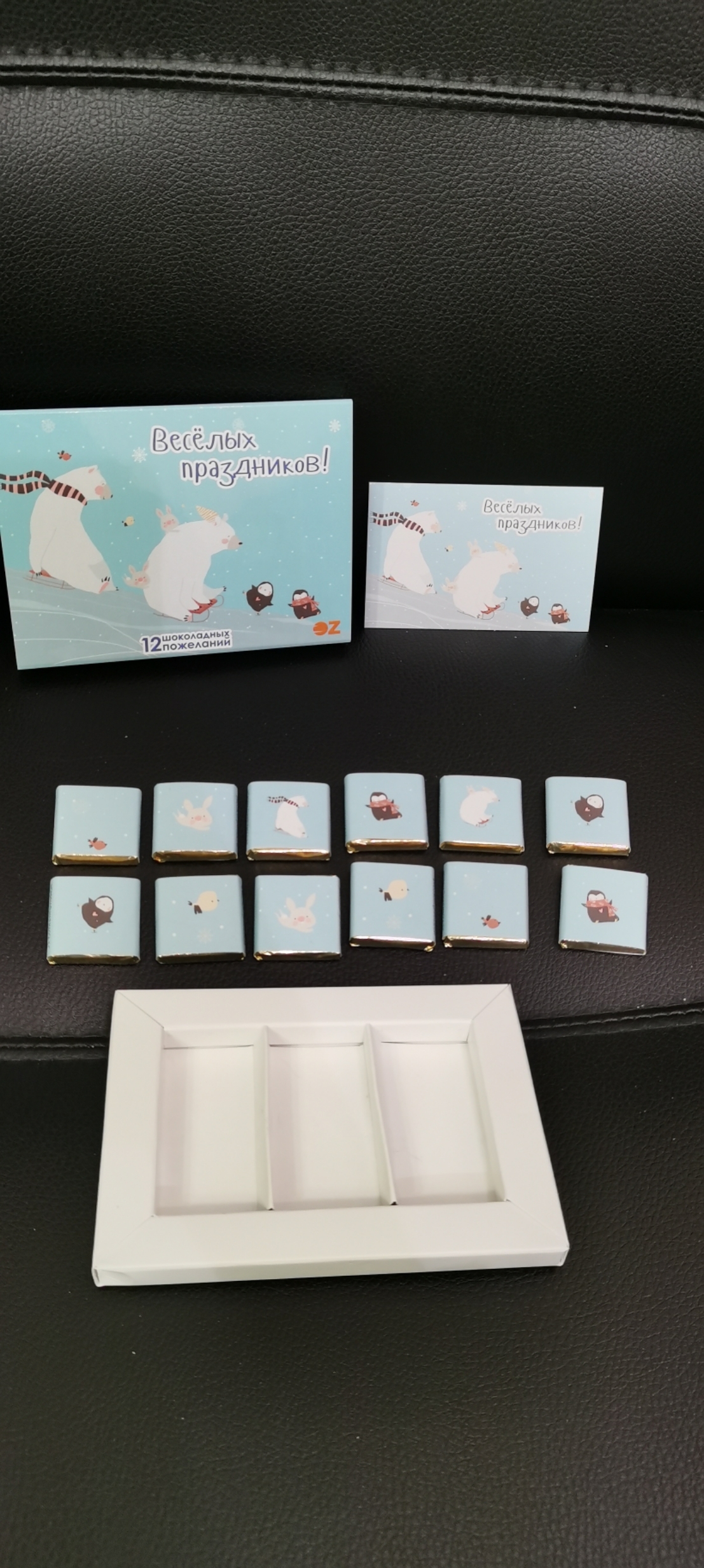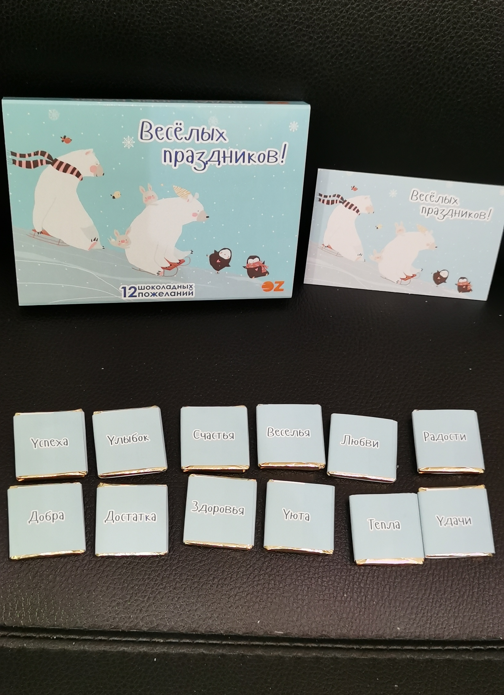 Молочный шоколад с новогодними пожеланиями. Как раз к праздникам будет очень актуален. Милые иллюстрации и пожелания в коробочке. Ещё внутри и открытка.