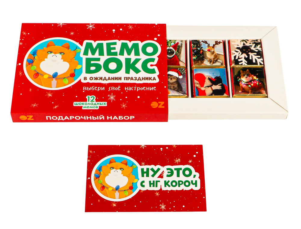 Подарочный набор "Мемобокс. В ожидании праздника" – это смешной новогодний подарочный набор с красноречивым шоколадом. На каждой плиточке изображен мем, который как нельзя лучше описывает разные жизненные ситуации. Выбери своё настроение в этот Новый год.