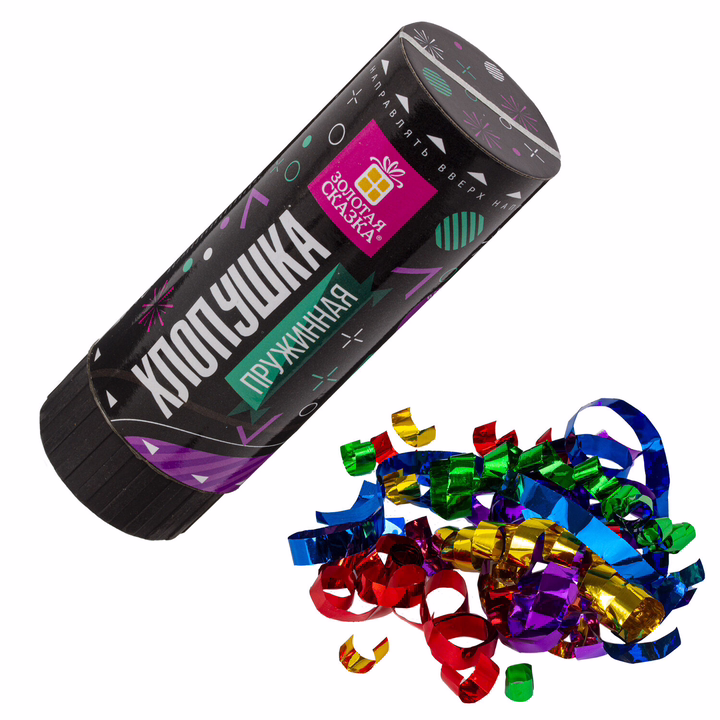 Хлопушка высотой 11 см с фольгированным наполнителем в виде серпантина и конфетти цвета ассорти является абсолютно безопасной, так как действует на основе пружинного механизма. Не является пиротехникой.