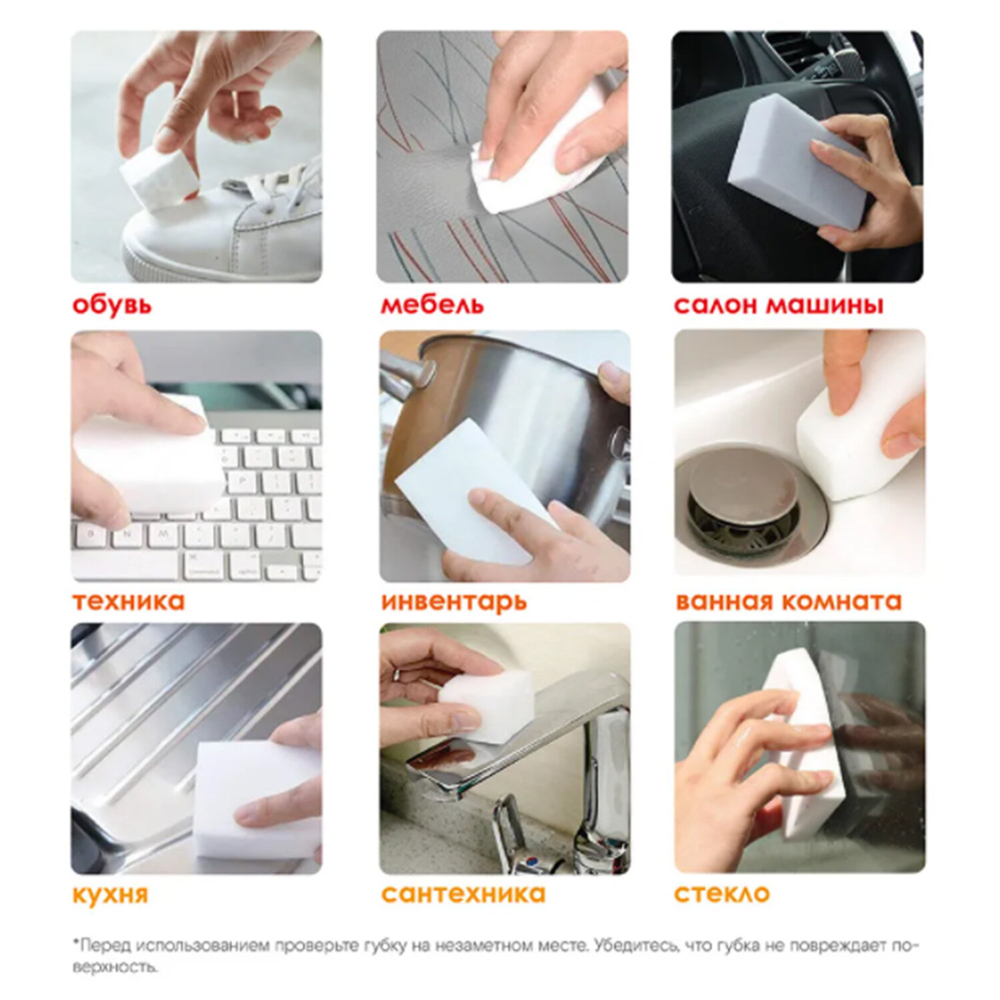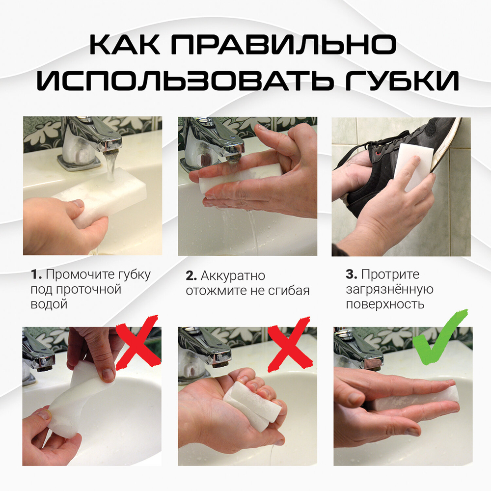 Губка состоит из 100% вспененного меламина (моющего вещества). Можно использовать как ластик, который удаляет застарелые загрязнения различного рода с кафеля, обуви, пластика, кожи и других поверхностей. Другие моющие средства вместе с ней не применяются – меламиновая губка сама является моющим средством при взаимодействии с водой. Перед применением необходимо поместить меламиновую губку в емкость с холодной водой, аккуратно отжать между ладонями, чтобы меланин вступил в реакцию. Скручивать нежелательно (может нарушится целостность губки). Рекомендуем пользоваться перчатками. Беречь от детей и домашних животных.