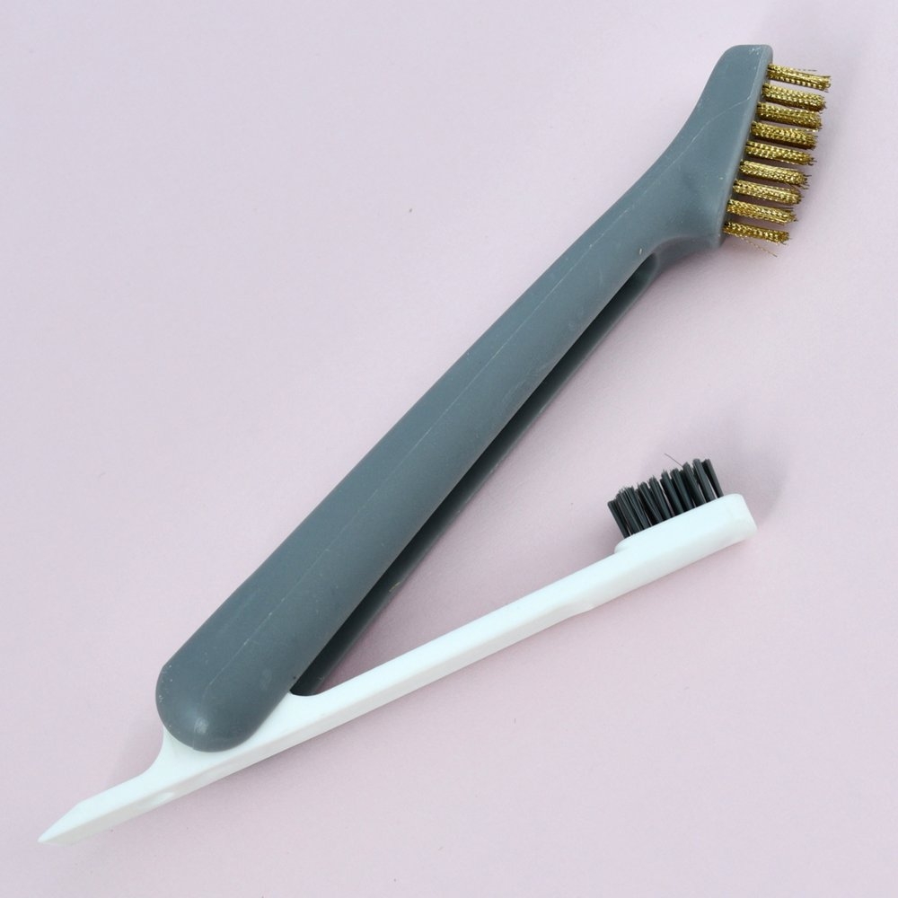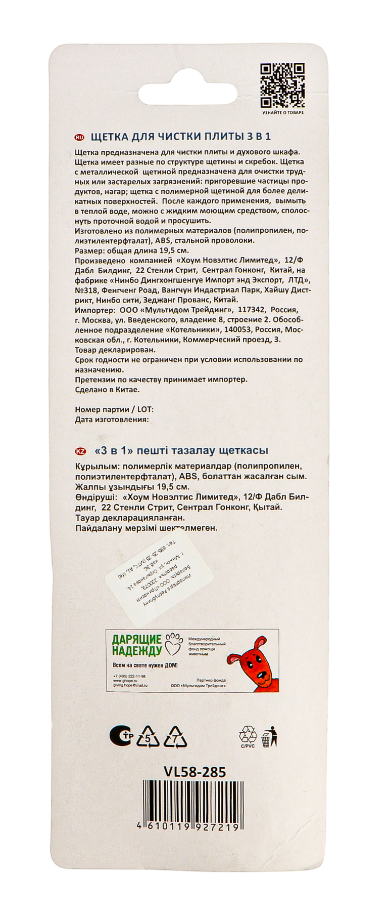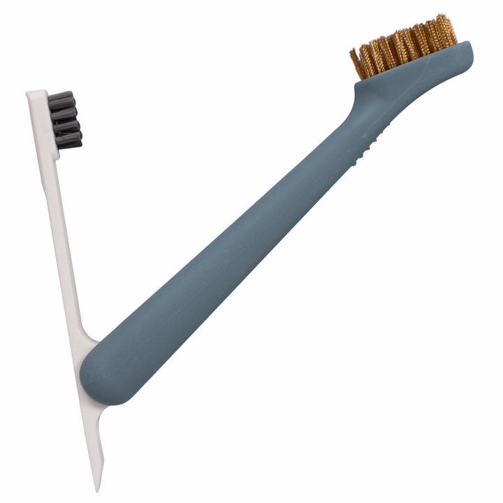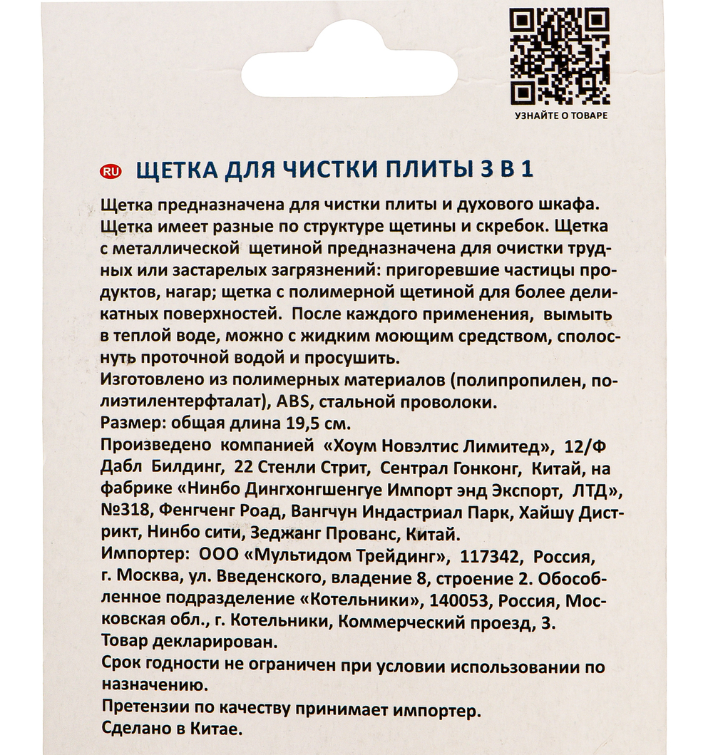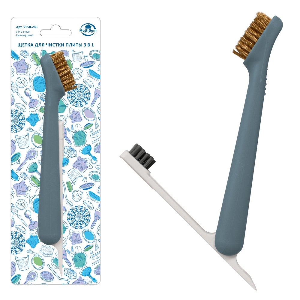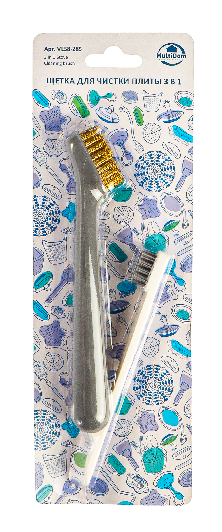 Щетка предназначена для чистки плиты и духового шкафа. Щетка имеет разные по структуре щетины и скребок. Щетка с металлической щетиной предназначена для очистки трудных или застарелых загрязнений: пригоревшие частицы продуктов, нагар; щетка с полимерной щетиной для более деликатных поверхностей.