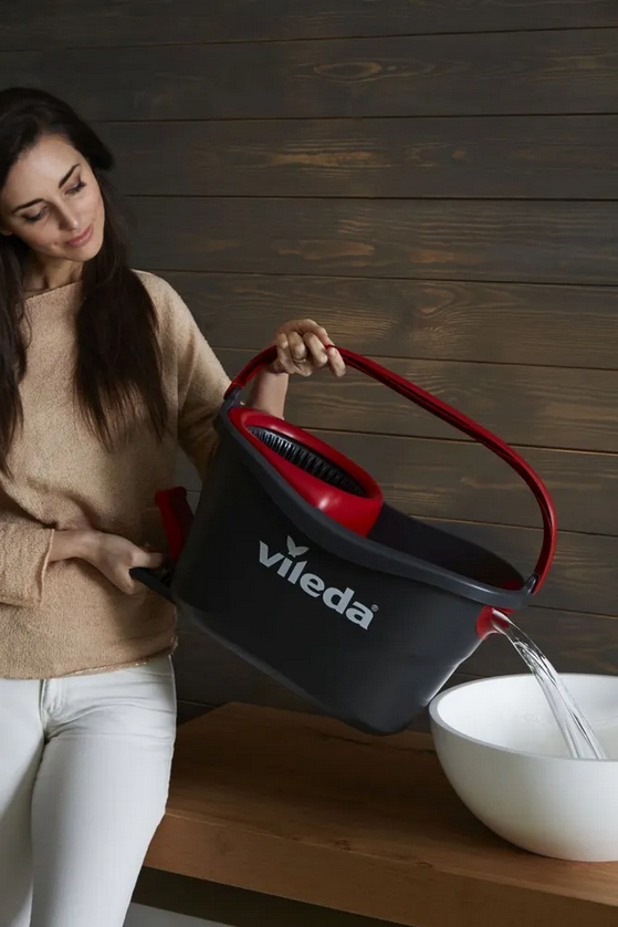 На внутренней поверхности ведра интегрирована шкала делений (для удобства дозирования моющих средств) и уровня максимум. Так же на ведре есть специальный носик и выемка под руку для удобства выливания воды. Есть фиксатор для ручки швабры, удобный при перемещении ведра и хранении набора.