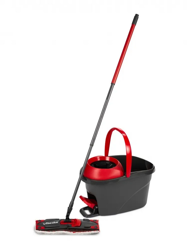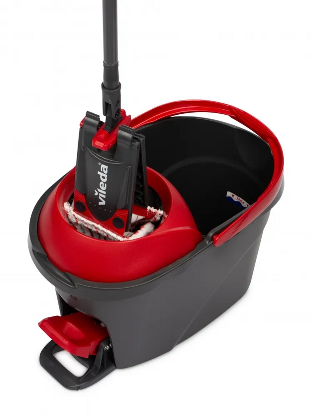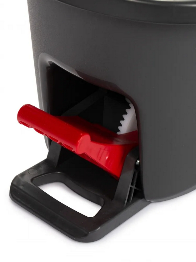 Ведро обладает прочной и качественной педалью для оптимального отжима швабры. Воронка на ведре защищает от брызг во время отжима швабры. Насадка из 100% микрофибры прекрасно впитывает, легко отжимается и идеально удаляет любые загрязнения.