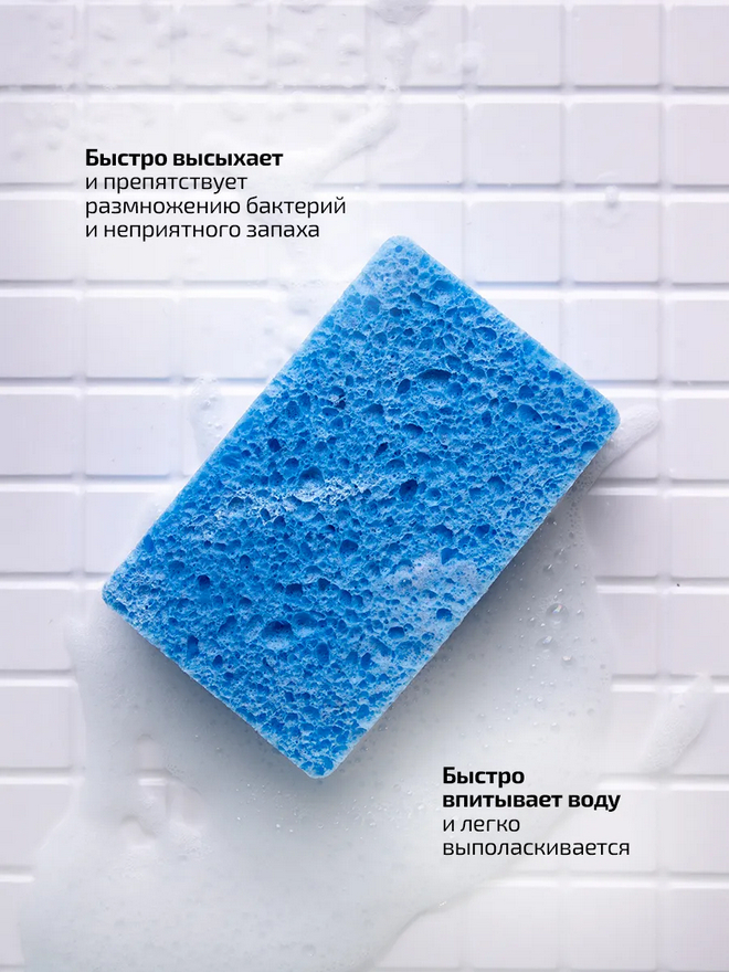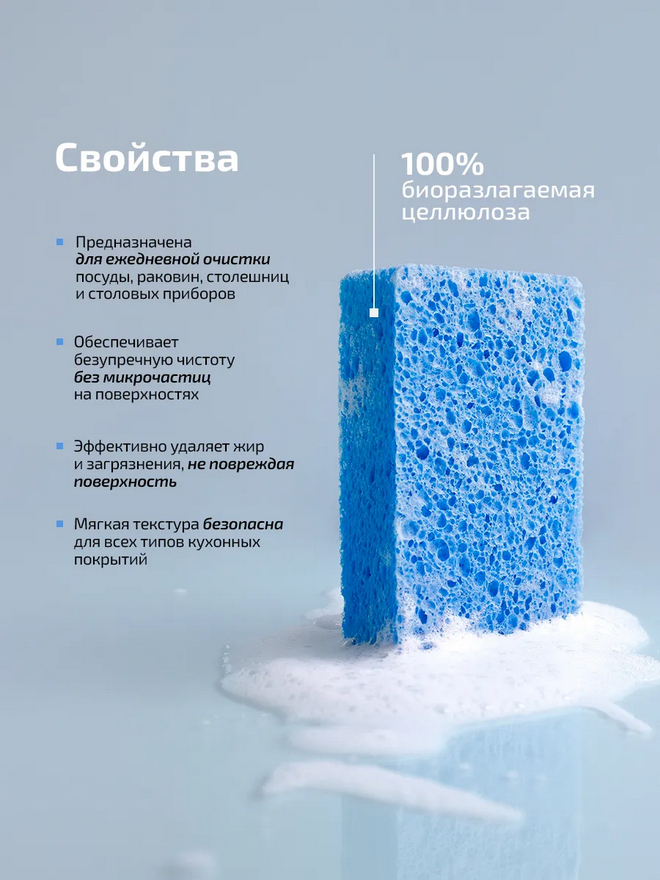 Мягкая текстура безопасна для всех типов кухонных покрытий. Компактная и простая в использовании губка помогает поддерживать чистоту и свежесть на вашей кухне.