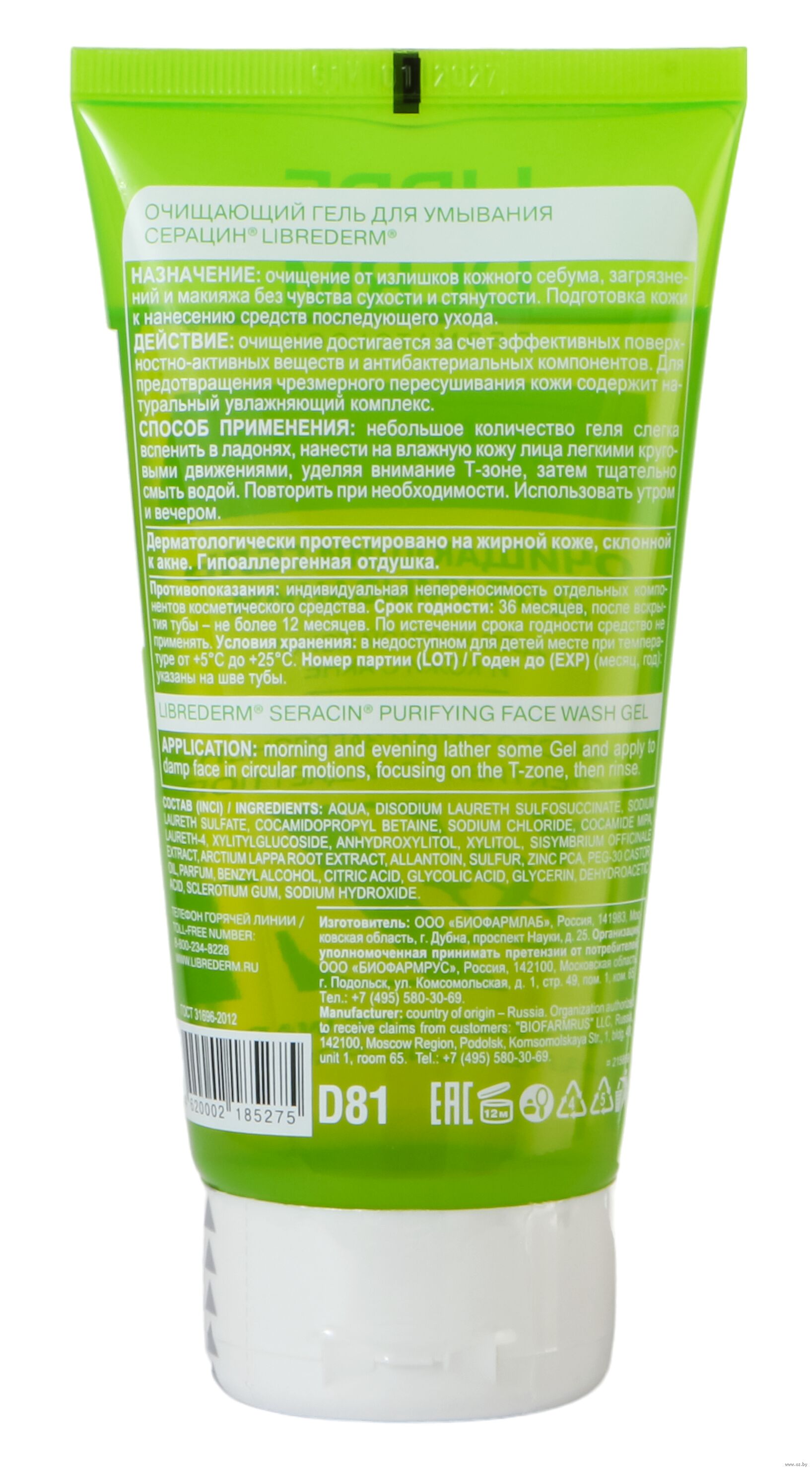 Небольшое количество геля слегка вспенить в ладонях, затем нанести на влажную кожу лица легкими круговыми движениями, уделяя внимание Т-зоне, затем тщательно смыть водой.Состав