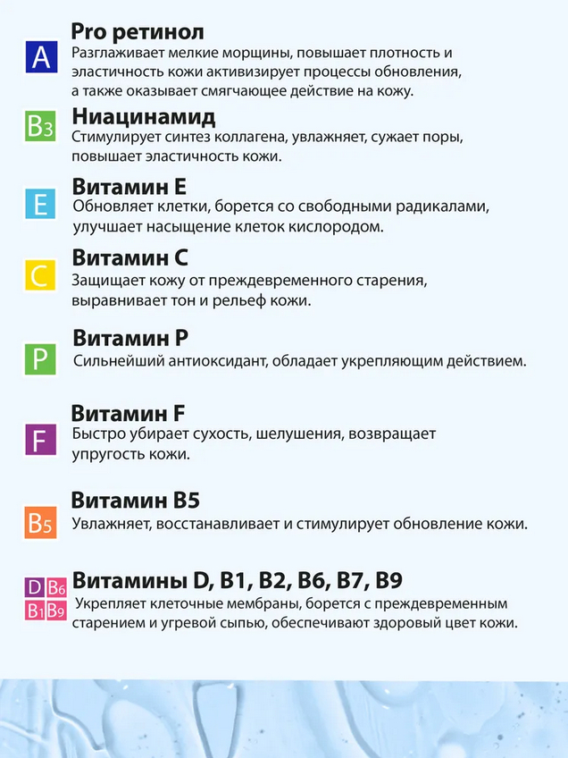 Активный комплекс Pro Retinol и 12 витаминов способствуют активизации процессов обновления, стимулируют синтез коллагена, увлажняют и насыщают клетки кислородом.
