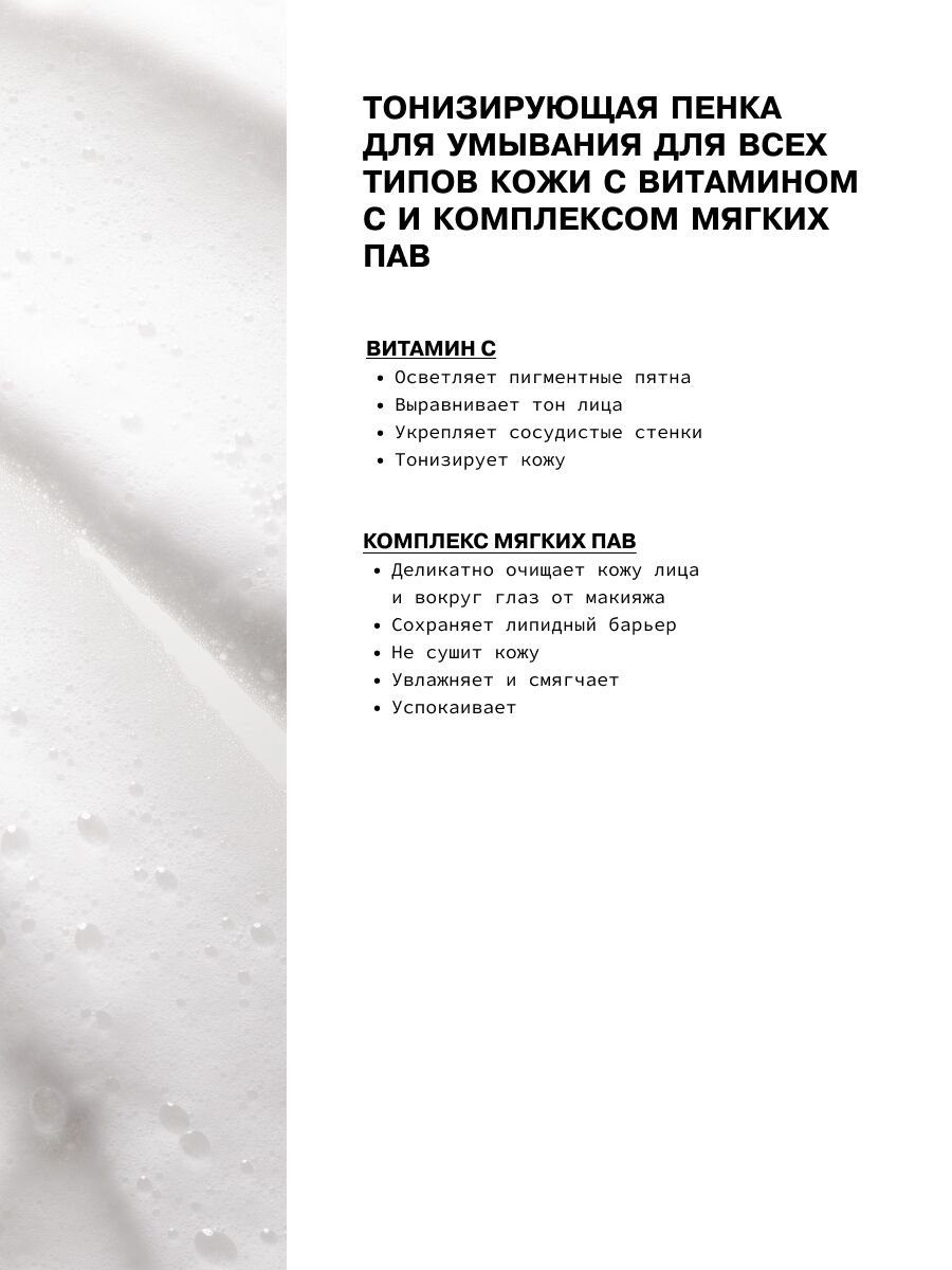 Комплекс мягких ПАВ очищает кожу от пыли, пота, себума и других загрязнений из окружающей среды, не пересушивая её. Витамин С придаёт пенке тонизирующий и осветляющий эффект, укрепляет сосуды, выравнивает тон кожи.