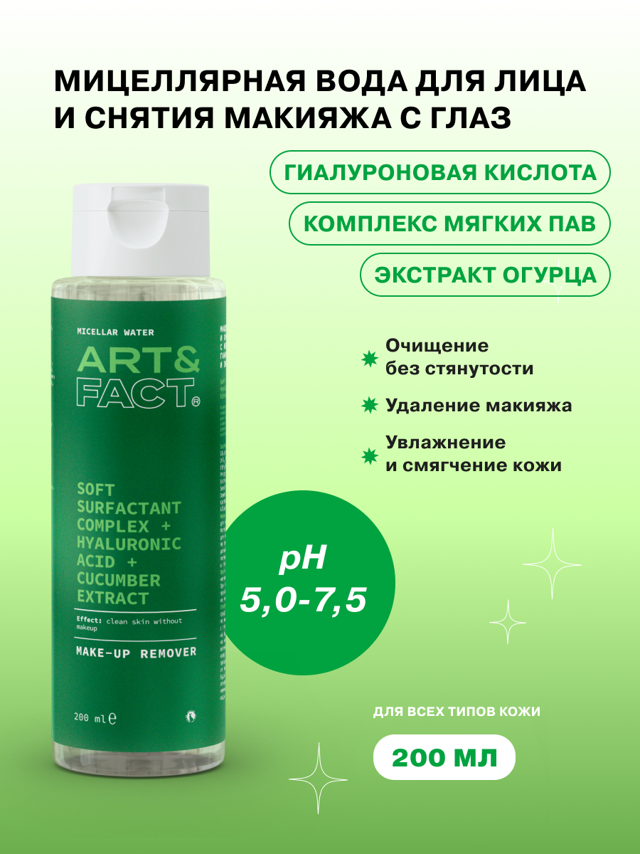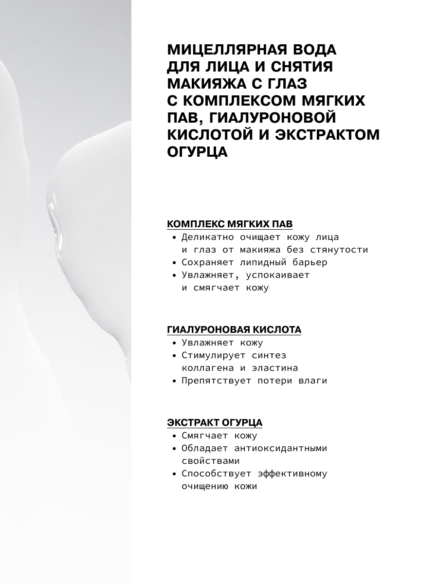 Мицеллярная вода для лица и снятия макияжа с глаз с комплексом мягких ПАВ, гиалуроновой кислотой и экстрактом огурца.