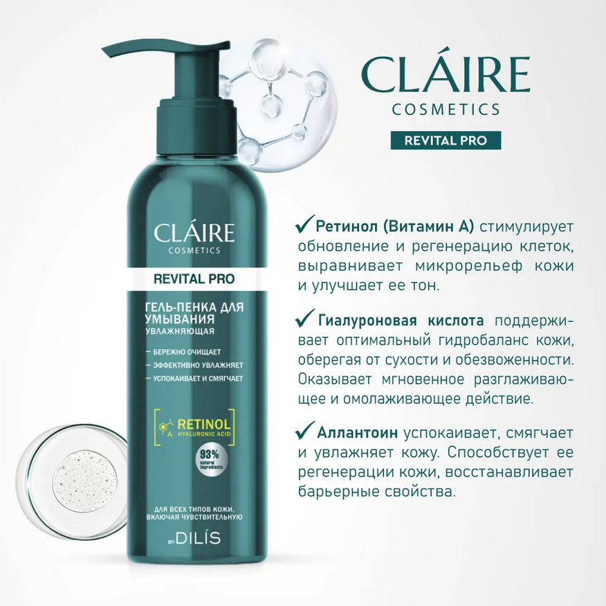 Благодаря специально подобранным ингредиентам гель-пенка подходит для очищения даже чувствительной кожи. Ретинол (Витамин А) стимулирует обновление и регенерацию клеток. Усиливает выработку собственного коллагена, эластина, липидов и гиалуроновой кислоты, выравнивает микрорельеф кожи и улучшает ее тон: кожа уплотняется, становится более эластичной, сокращается глубина морщин, разглаживаются мелкие морщинки.