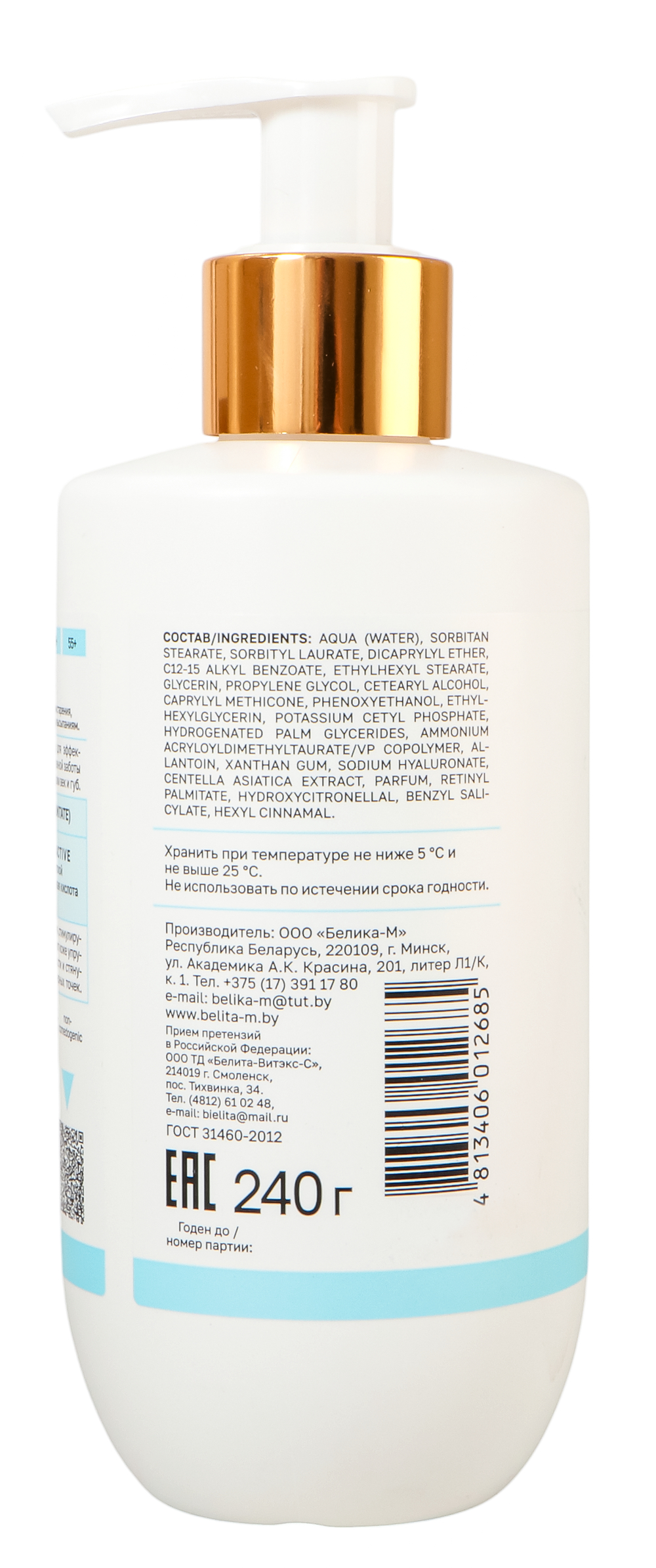 Аqua (water), sorbitan stearate, sorbityl laurate, dicaprylyl ether, c12-15 alkyl benzoate, ethylhexyl stearate, glycerin, propylene glycol, cetearyl alcohol, caprylyl methicone, phenoxyethanol, ethylhexylglycerin, potassium cetyl phosphate, hydrogenated palm glycerides, ammonium acryloyldimethyltaurate/ vp copolymer, allantoin, xanthan gum, sodium hyaluronate, centella asiatica extract, parfum, retinyl palmitate, hydroxycitronellal, benzyl salicylate, hexyl cinnamal.