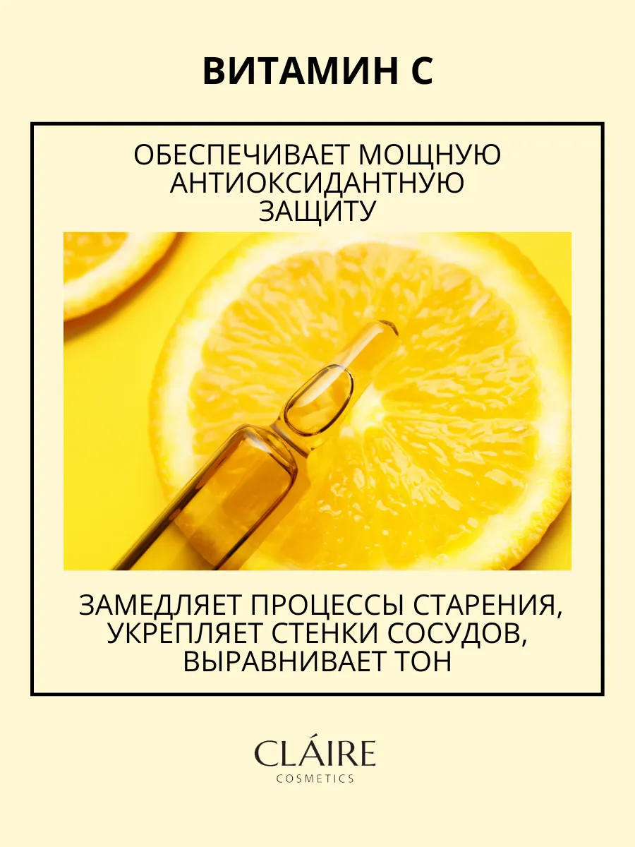 Входящий в состав витамин C стабильной формы обеспечивает мощную антиоксидантную защиту, замедляет процессы старения, укрепляет стенки сосудов, выравнивает тон. Аллантоин увлажняет, смягчает и успокаивает кожу, восстанавливает защитный барьер эпидермиса.