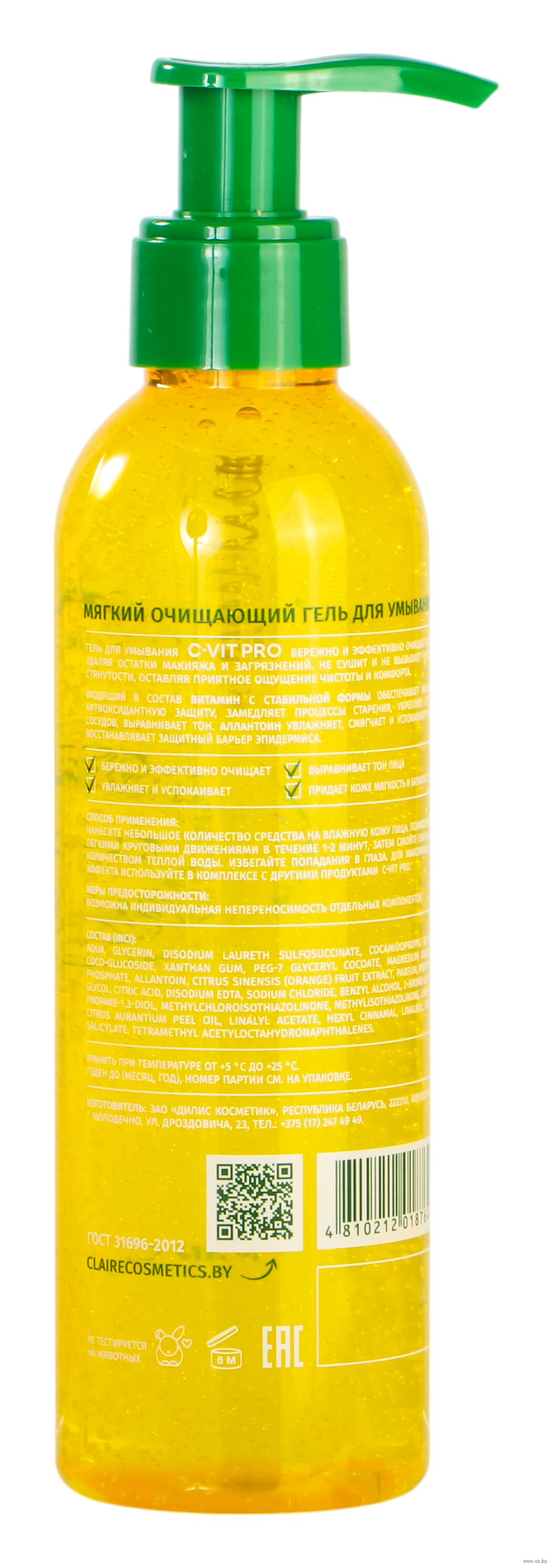 Нанесите небольшое количество средства на влажную кожу лица. Помассируйте легкими круговыми движениями в течение 1-2 минут, затем смойте обильным количеством теплой воды, избегайте попадания в глаза. Для максимального эффекта используйте в комплексе с другими продуктами C-VIT PRO.Состав