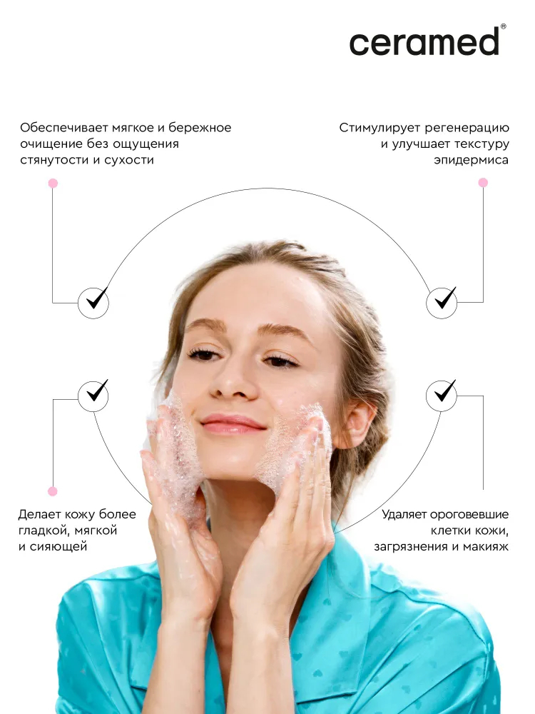 Требует нанесения на влажную кожу, вспенивания и смывания водой.