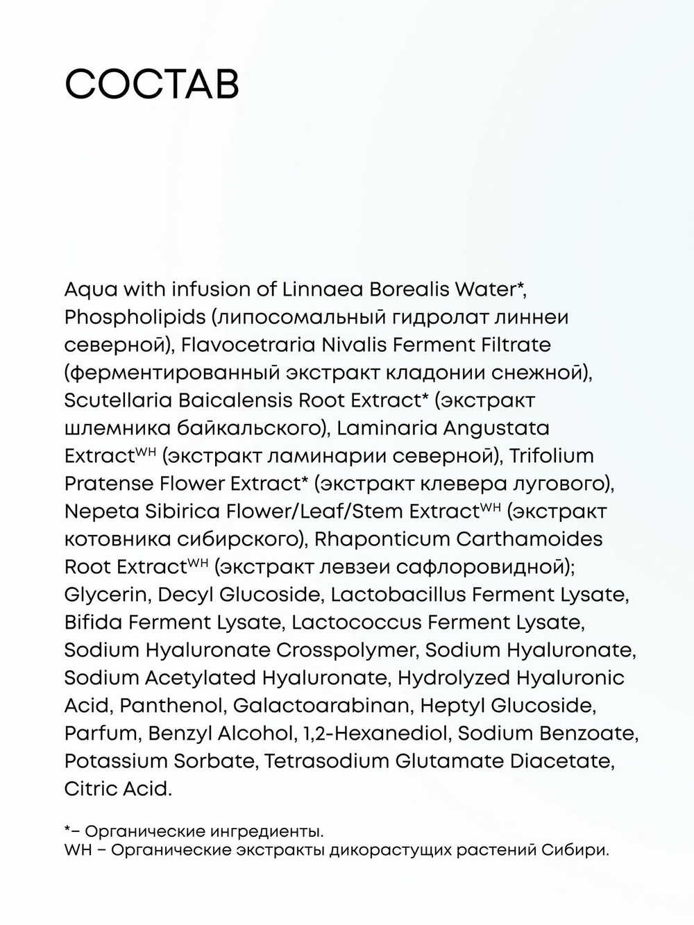 Aqua with infusion of Linnaea Borealis Water*, Phospholipids (липосомальный гидролат линнеи северной), Flavocetraria Nivalis Ferment Filtrate (ферментированный экстракт кладонии снежной), Scutellaria Baicalensis Root Extract* (экстракт шлемника байкальского), Laminaria Angustata ExtractWH (экстракт ламинарии северной), Trifolium Pratense Flower Extract* (экстракт клевера лугового), Nepeta Sibirica Flower/Leaf/Stem ExtractWH (экстракт котовника сибирского), Rhaponticum Carthamoides Root ExtractWH (экстракт левзеи сафлоровидной); Glycerin, Decyl Glucoside, Lactobacillus Ferment Lysate, Bifida Ferment Lysate, Lactococcus Ferment Lysate, Sodium Hyaluronate Crosspolymer, Sodium Hyaluronate, Sodium Acetylated Hyaluronate, Hydrolyzed Hyaluronic Acid, Panthenol, Galactoarabinan, Heptyl Glucoside, Parfum, Benzyl Alcohol, 1,2-Hexanediol, Sodium Benzoate, Potassium Sorbate, Tetrasodium Glutamate Diacetate, Citric Acid.