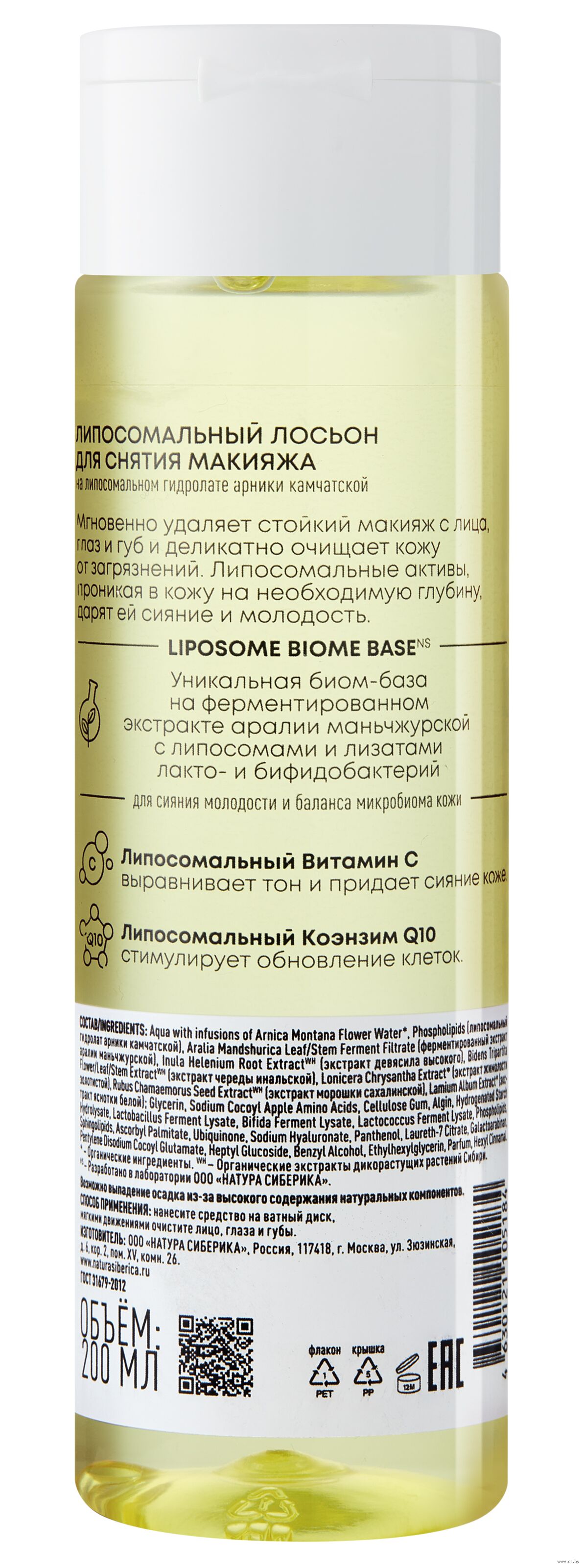 Липосомальный лосьон для снятия макияжа на липосомальном гидролате арники камчатской. Мгновенно удаляет стойкий макияж с лица, глаз и губ и деликатно очищает кожу от загрязнений.