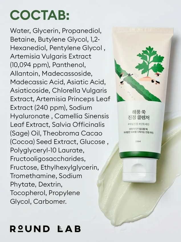 Water, Glycerin , Sodium Cocoyl Glycinate, Sodium Lauroyl Glutamate , Butylene Glycol , Coco-Betaine, Betaine, Hydroxypropyl Starch Phosphate, Artemisia Vulgaris Extract (10,045 ppm), Artemisia Princeps Leaf Extract (800 ppm), Madecassoside, Asiaticoside, Asiatic Acid, Madecassic Acid, Panthenol, Allantoin, Melia Azadirachta Leaf Extract, Malt Extract, Camellia Sinensis Leaf Extract, Melia Azadirachta Flower Extract, Sodium Chloride, Aspartic Acid, Caprylyl Glycol, Polyquaternium-67, 1,2-Hexanediol, Ethylhexylglycerin , Citric Acid, Salvia Officinalis (Sage) Oil.