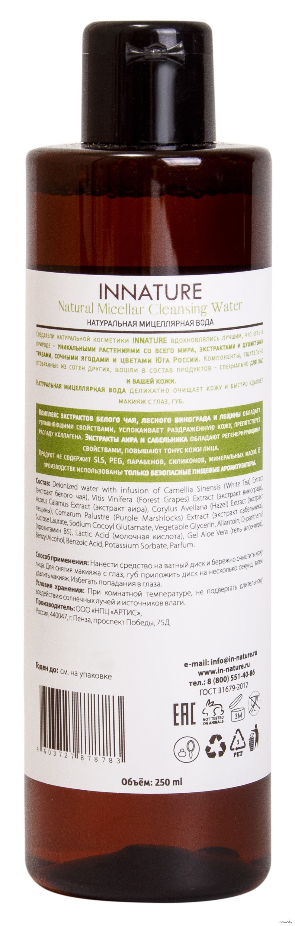 Deionized water with infusion of Camellia Sinensis (White Tea) Extract (экстракт белого чая), Vitis Vinifera (Forest Grapes) Extract (экстракт винограда), Acorus Calamus Extract (экстракт аира), Corylus Avellana (Hazel) Extract (экстракт лещины), Comarum Palustre (Purple Marshlocks) Еxtract (экстракт сабельника), Sucrose Laurate, Sodium Cocoyl Glutamate, Vegetable Glycerin, Allantoin, D-panthenol (провитамин В5), Lactic Acid (молочная кислота), Gel Aloe Vera (гель алоэ-вера), Benzyl Alcohol, Benzoic Acid, Potassium Sorbate, Parfum.