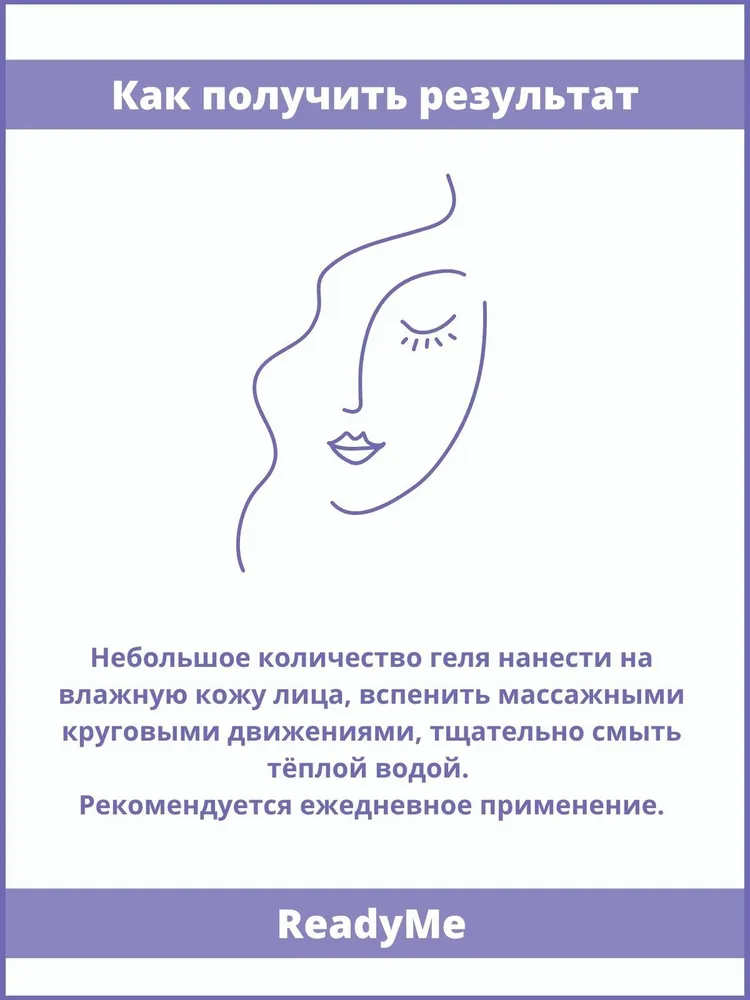 Небольшое количество геля нанести на влажную кожу лица, вспенить массажными круговыми движениями, тщательно смыть тёплой водой. Рекомендуется ежедневное применение.Состав